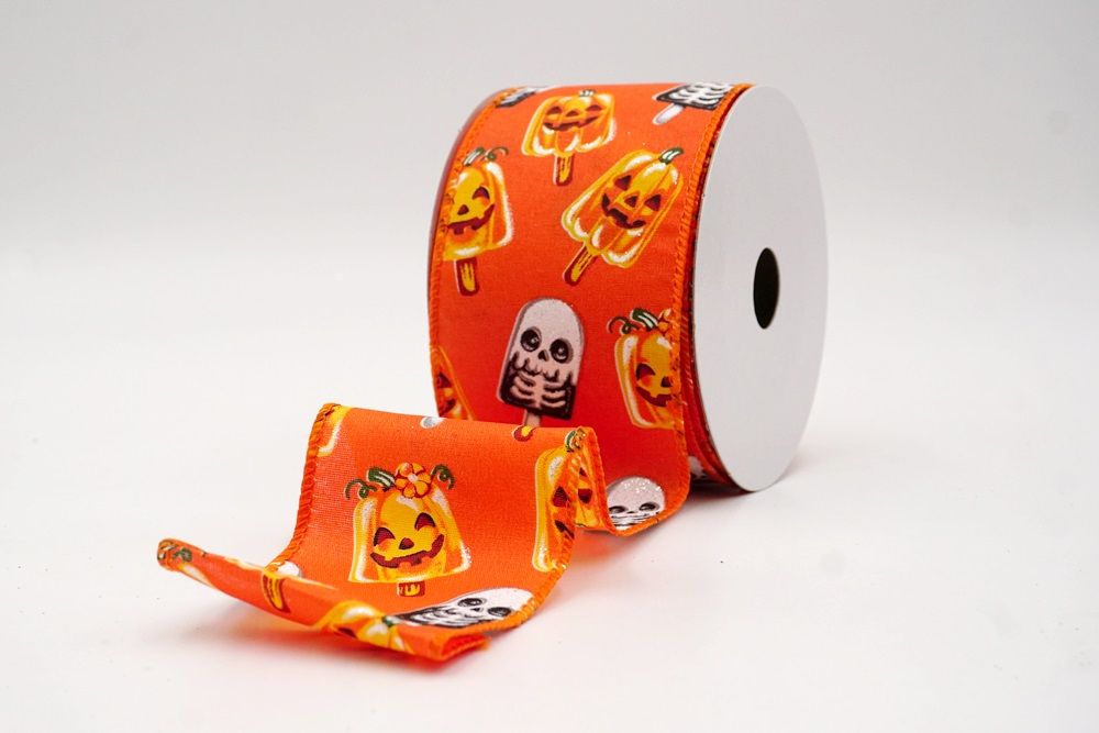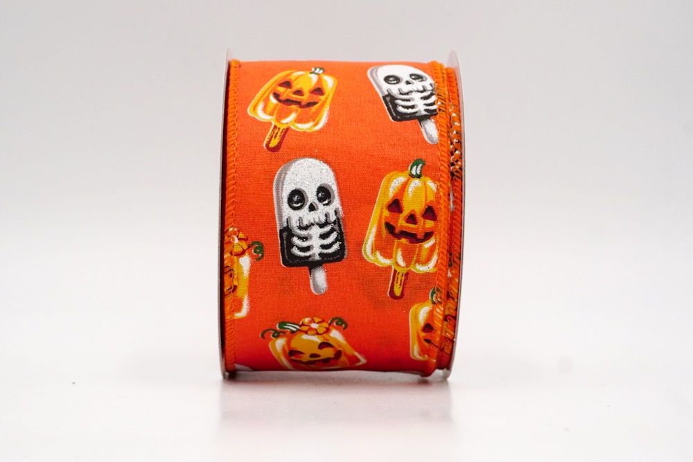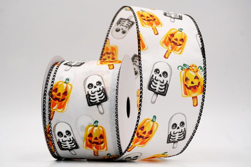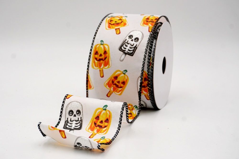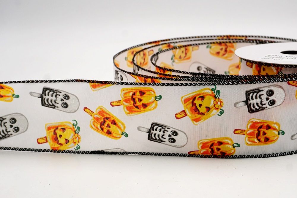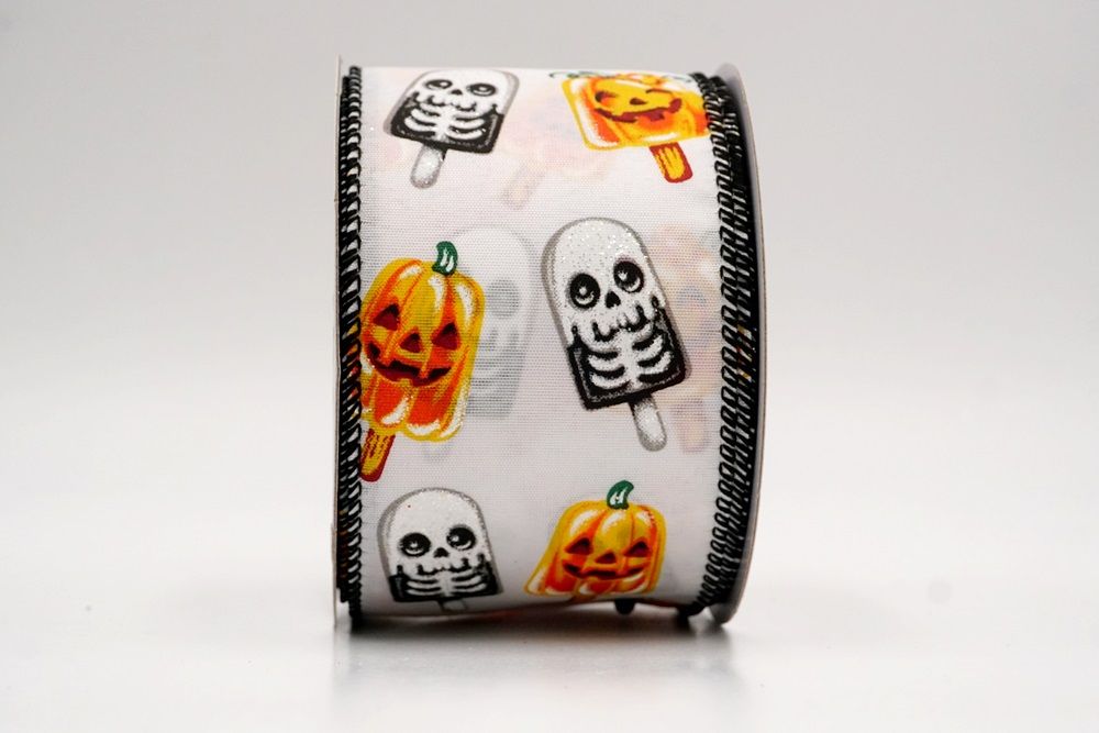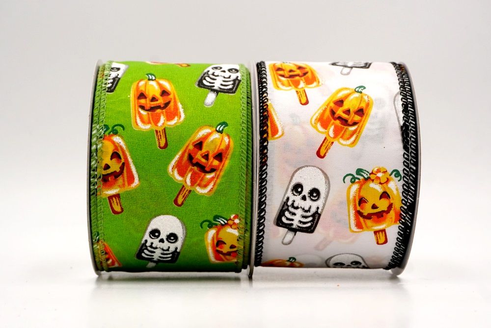 रिबन पर डिज़ाइन विभिन्न हैलोवीन-थीम वाले जमे हुए नाश्ते को पृष्ठभूमि के रंग में बिखरे हुए दिखाता है। विशेष रूप से बड़े, मुस्कुराते हुए चेहरे के साथ संतरे के कद्दू के आकार को प्रमुखता से प्रदर्शित किया गया है, जिसे एक स्टिक पर पॉप्सिकल की तरह दिखने के लिए डिज़ाइन किया गया है। ये खुशमिजाज कद्दू सफेद कंकाल पॉप्सिकल के साथ जोड़े गए हैं, जिनके चेहरे पर एक गहरा, कार्टून जैसा हड्डी का ढांचा है, जो थोड़ा डरावना लगता है। दो अलग-अलग पॉप्सिकल छवियाँ कपड़े पर यादृच्छिक रूप से दिखाई देती हैं। रिबन की सीमा, जब मौजूद होती है, अक्सर उज्ज्वल, व्यस्त केंद्रीय छवि को फ्रेम करने के लिए एक ठोस रंग का उपयोग करती है। चूंकि रिबन के किनारे पर तार है, इसे विशेष आकार में मोड़ना आसान है और यह अपनी जगह पर अच्छी तरह से रहता है। तार विभिन्न सामग्रियों, जैसे कि फोम व्रथ बेस या एक मजबूत सजावटी शाखा पर रिबन को सुरक्षित करने के लिए सहायक है।
