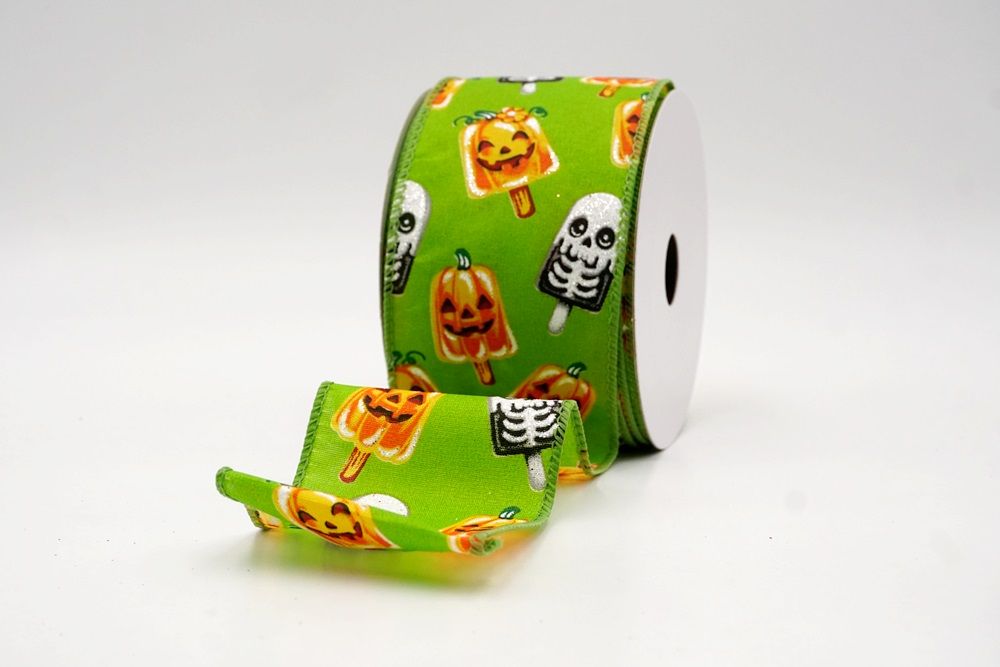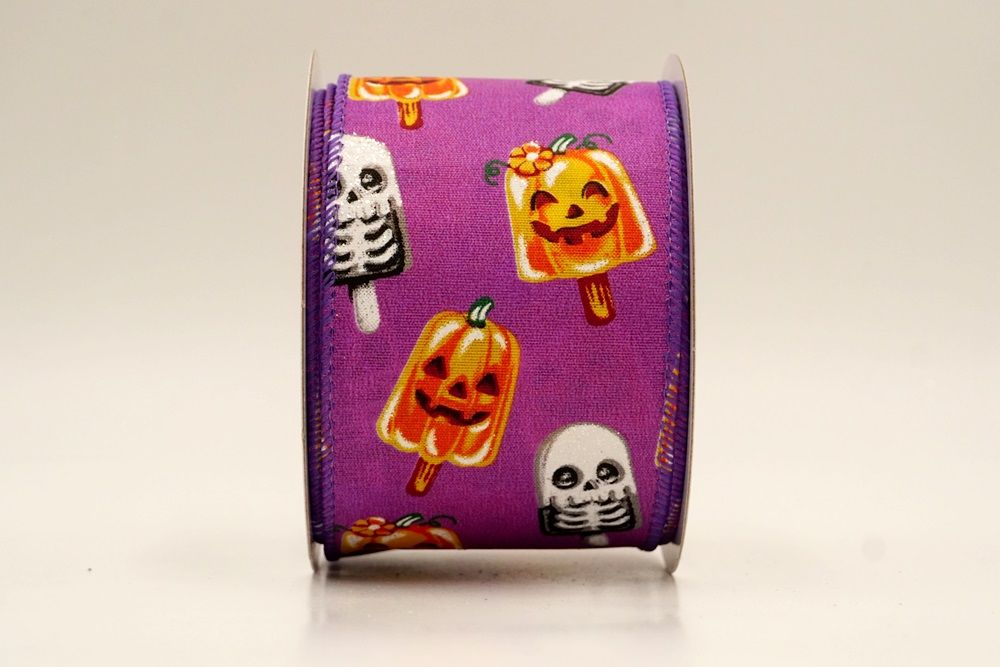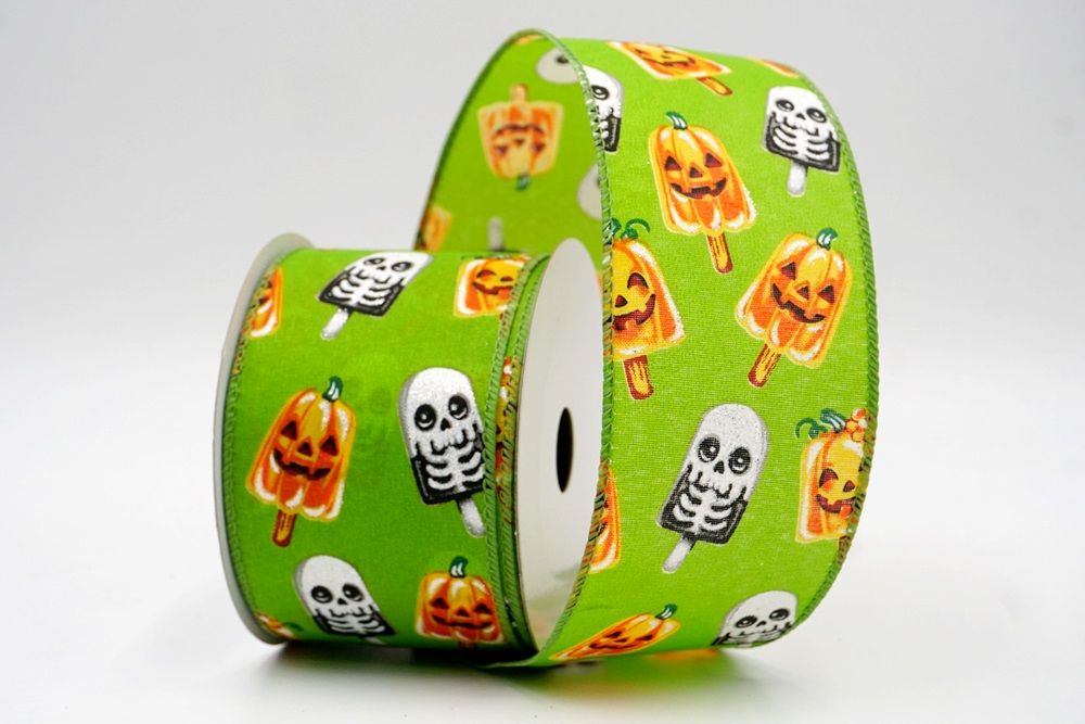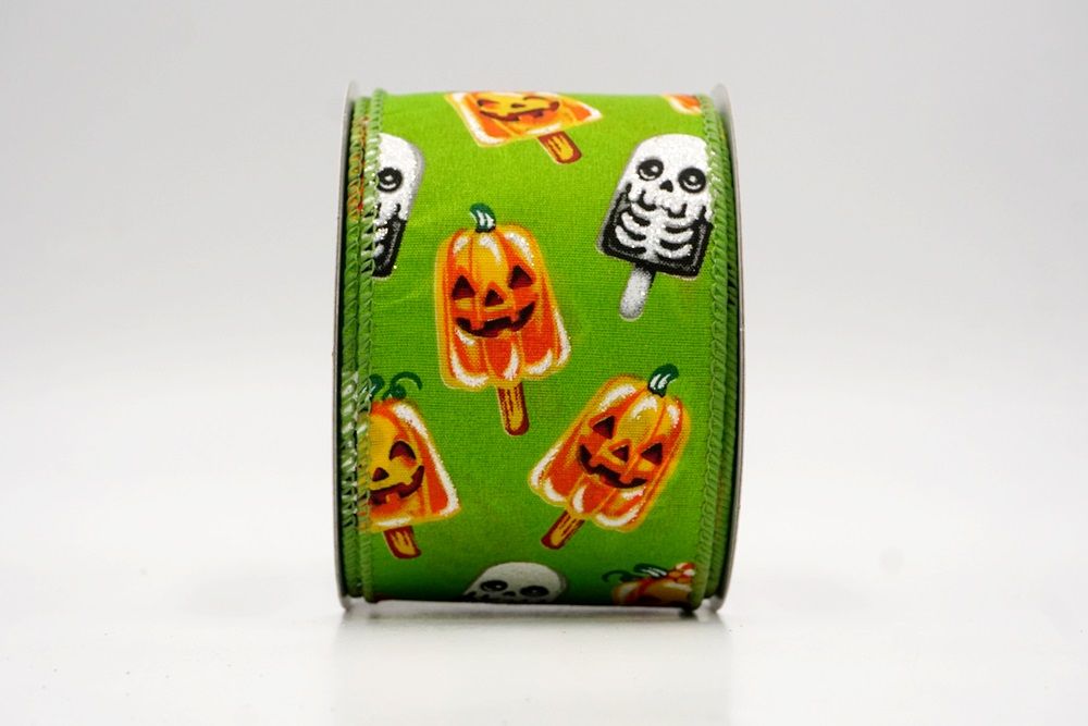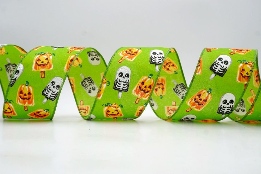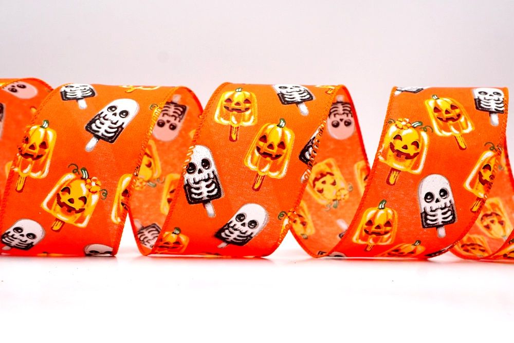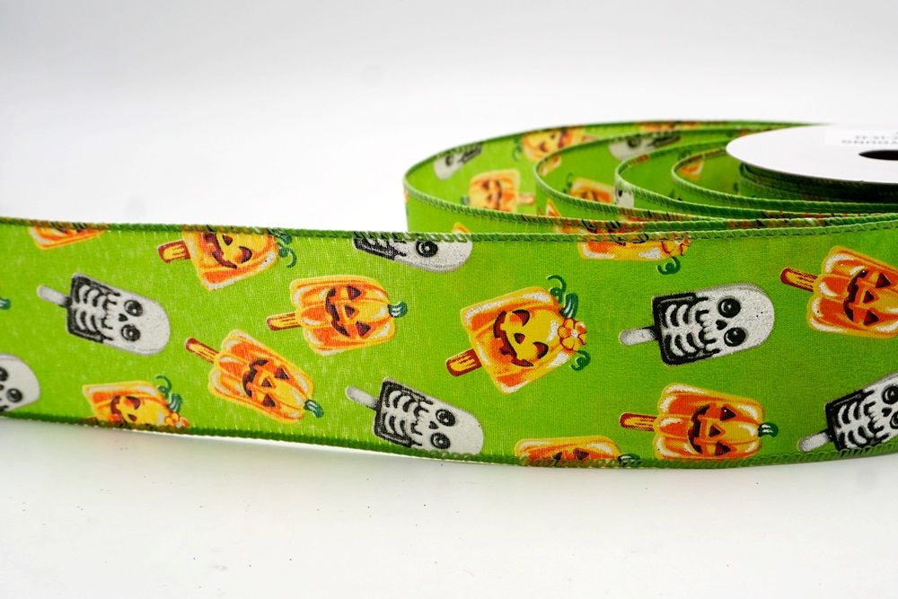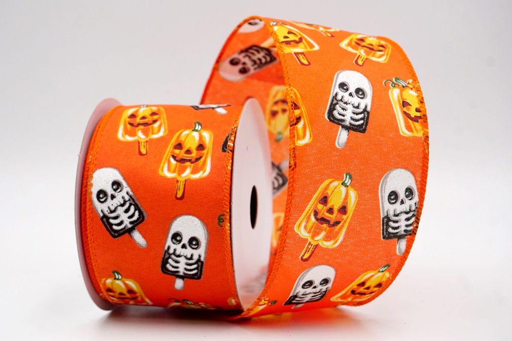 रिबन पर डिज़ाइन विभिन्न हैलोवीन-थीम वाले जमे हुए नाश्ते को पृष्ठभूमि के रंग में बिखरे हुए दिखाता है। विशेष रूप से बड़े, मुस्कुराते हुए चेहरे के साथ संतरे के कद्दू के आकार को प्रमुखता से प्रदर्शित किया गया है, जिसे एक स्टिक पर पॉप्सिकल की तरह दिखने के लिए डिज़ाइन किया गया है। ये खुशमिजाज कद्दू सफेद कंकाल पॉप्सिकल के साथ जोड़े गए हैं, जिनके चेहरे पर एक गहरा, कार्टून जैसा हड्डी का ढांचा है, जो थोड़ा डरावना लगता है। दो अलग-अलग पॉप्सिकल छवियाँ कपड़े पर यादृच्छिक रूप से दिखाई देती हैं। रिबन की सीमा, जब मौजूद होती है, अक्सर उज्ज्वल, व्यस्त केंद्रीय छवि को फ्रेम करने के लिए एक ठोस रंग का उपयोग करती है। चूंकि रिबन के किनारे पर तार है, इसे विशेष आकार में मोड़ना आसान है और यह अपनी जगह पर अच्छी तरह से रहता है। तार विभिन्न सामग्रियों, जैसे कि फोम व्रथ बेस या एक मजबूत सजावटी शाखा पर रिबन को सुरक्षित करने के लिए सहायक है।
