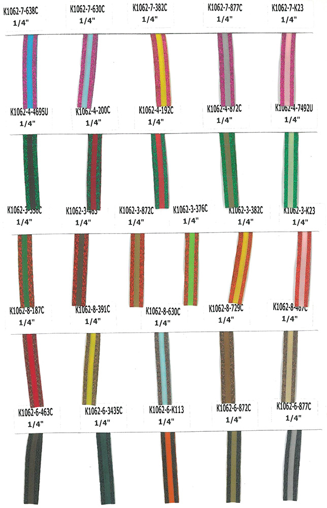 18mm पॉलिएस्टर और मेटालिक स्ट्राइप्ड रिबन में दो पॉलिएस्टर रंगीन यार्न और सोने या चांदी के मेटालिक यार्न के साथ पतली और मोटी स्ट्राइप्स बुने गए हैं। इसकी किनारे तार है ताकि बांधने वाले धागों की शक्ल बनी रहे। वर्तमान में 6 रंग की कम्बिनेशन में उपलब्ध है। क्रिसमस सजावट, उपहार पैकेजिंग, बांधने के लिए, क्राफ्टिंग, पार्टी फेवर्स और अधिक के लिए उत्कृष्ट।
