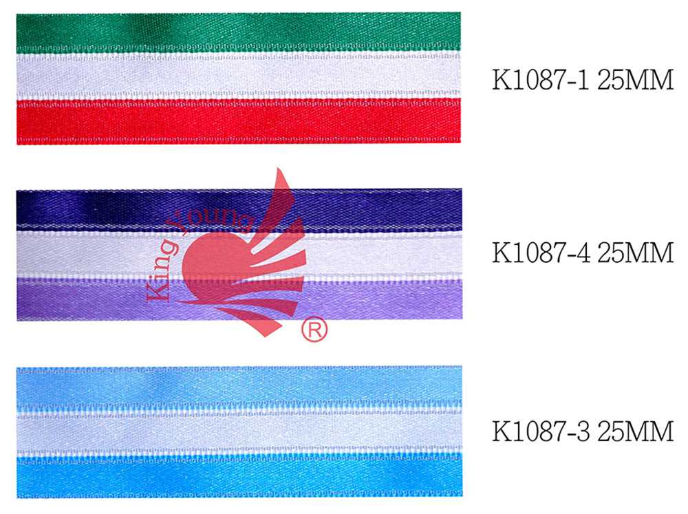 यह एक इंच (25 मिमी) का फैंसी बुना हुआ रिबन है जिसे 2 रंगों के पॉलिएस्टर यार्न से बनाया गया है, जिसमें से एक रंग सफेद है। यह रिबन इस प्रकार बुना है कि एक सिलाई रेखा रिबन के दो रंगों को अलग करती है। यह वर्तमान में गुलाबी, काला, पीला, हरा, हल्का गुलाबी, बेज, नीला, जामुनी, टॉफी और लाल रंग में उपलब्ध है। अनुरोध पर अनुकूलित कस्टम रंग व्यवस्थित किए जा सकते हैं। रिबन की किनारे में कोई तार नहीं है। गुणवत्ता सुनिश्चित की गई। हम इस रिबन को बनाने के लिए पर्यावरण के अनुकूल प्रथाओं को अपनाते हैं। रंग कार्ड अनुरोध पर उपलब्ध हैं। फाइबर सामग्री: 100% पॉलिएस्टर