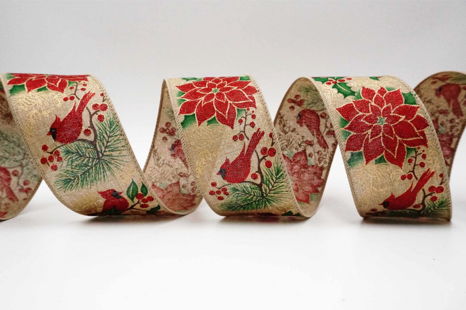 यह एक विशेष 2-1/2 इंच चौड़ी क्रिसमस रिबन है जिसमें लाल कार्डिनल्स और हॉलिडे प्लांटर डिज़ाइन हैं। लाल पक्षियाँ लाल गूची, हरे पाइन बीटल और हरे हॉली पत्तियों से बने पेड़ की डालों पर आराम कर रही हैं। इसके अलावा लाल पॉइंसेटिया के फूल हैं, जिन्हें सोने की रेखाओं से सजाया गया है ताकि यह रिबन और भी उत्सवपूर्ण लगे।