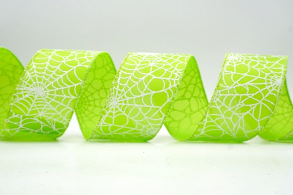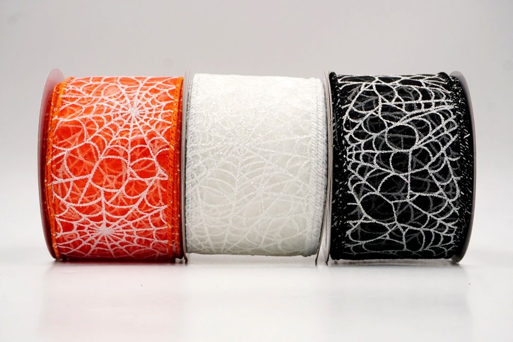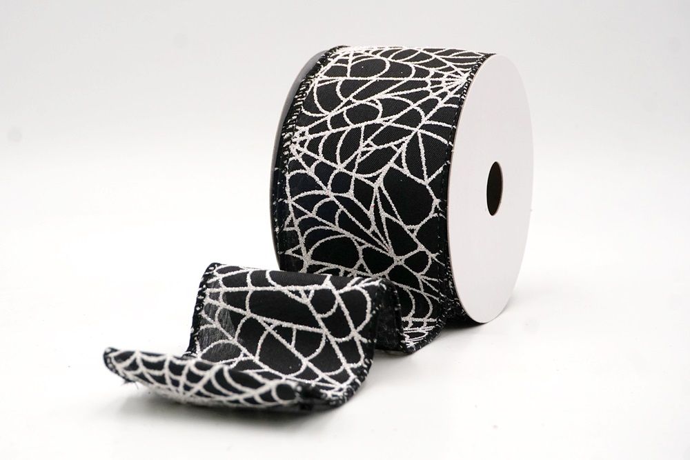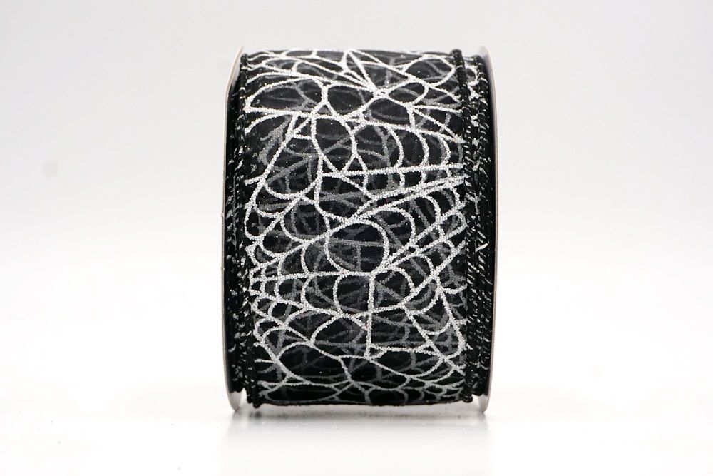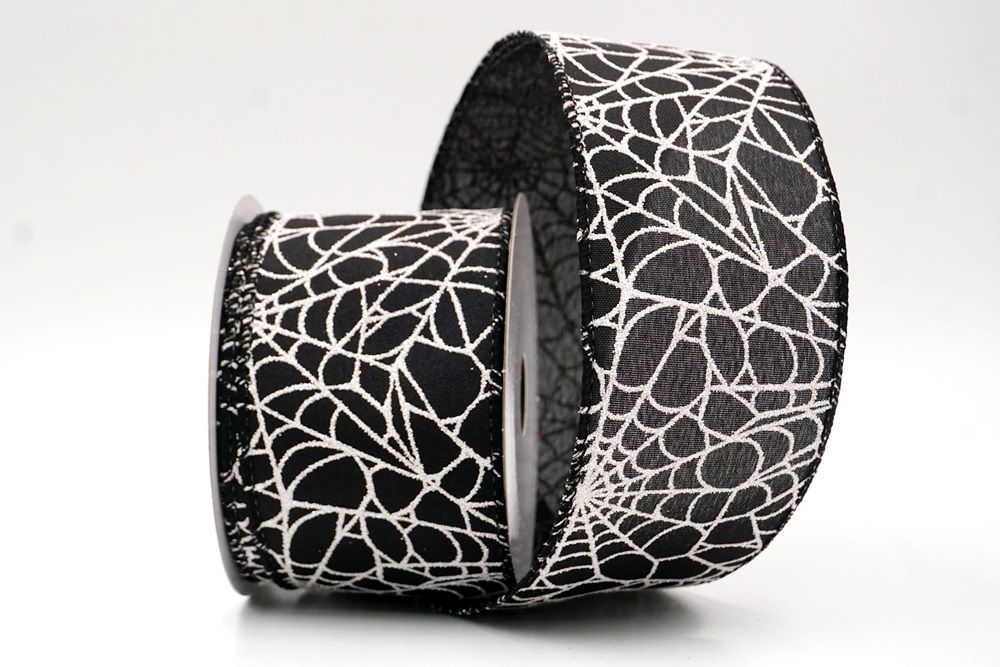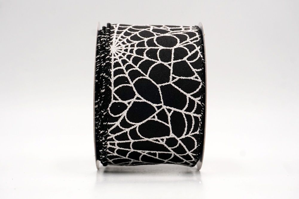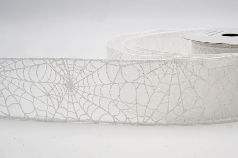 A szalagon látható vizuális elemek egy részletes és kissé ijesztő pókháló mintázatot mutatnak, amelyet fémes csillogás egészít ki. A szalag teljes felületét egy finom fehér hálós minta borítja, amely úgy néz ki, mint a finom csipke. Ez a webmintázat gyakran fényes, csillogó felülettel van nyomtatva, ami a szalagnak egy észrevehető csillogást kölcsönöz, mintha harmattal vagy fagyottal lenne borítva. Ez a csillogó hatás különösen figyelemfelkeltő a áttetsző anyagon, ahol a háttérszín átsüt a transzparens anyagon. A zsákvászon verzión a webes minta tisztán kiemelkedik a szilárd, texturált alap színnel szemben. Mivel a szalagban beépített drótél található, könnyen formázható drámai, szélfútta alakra, és szorosan rögzíthető. A drót lehetővé teszi a készítő számára, hogy a szalagot egy ijesztő, strukturált hajtást adjon, amely végig megőrzi formáját a rémisztő szezon során.