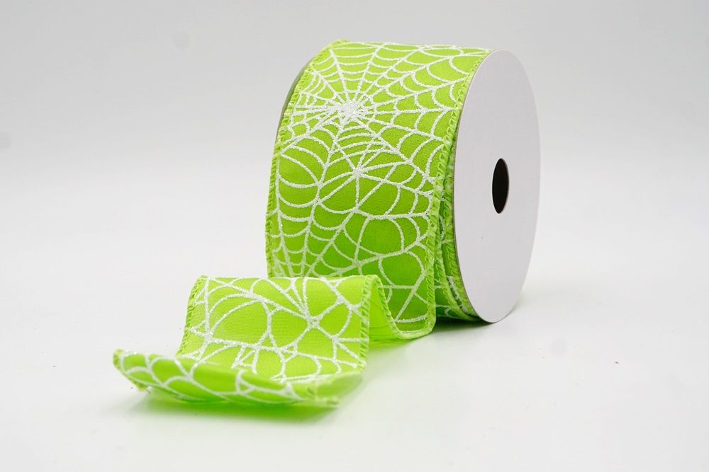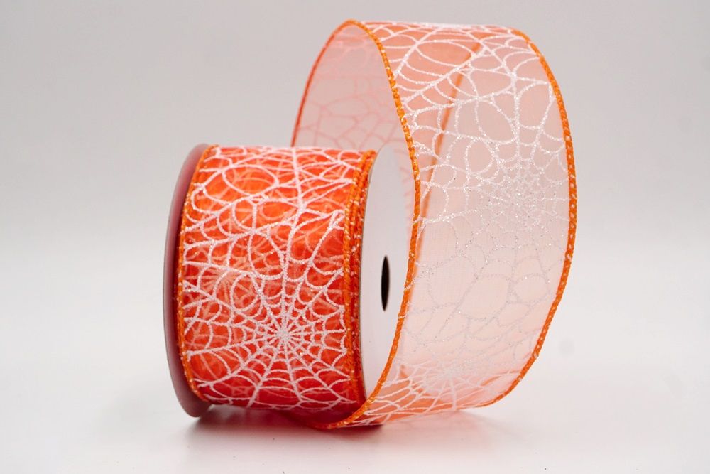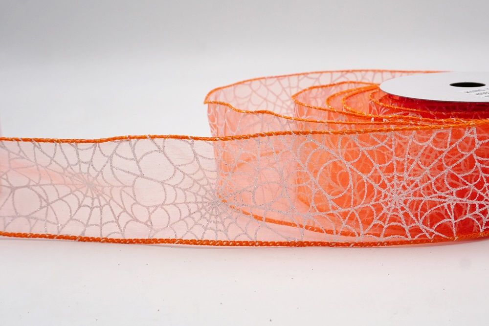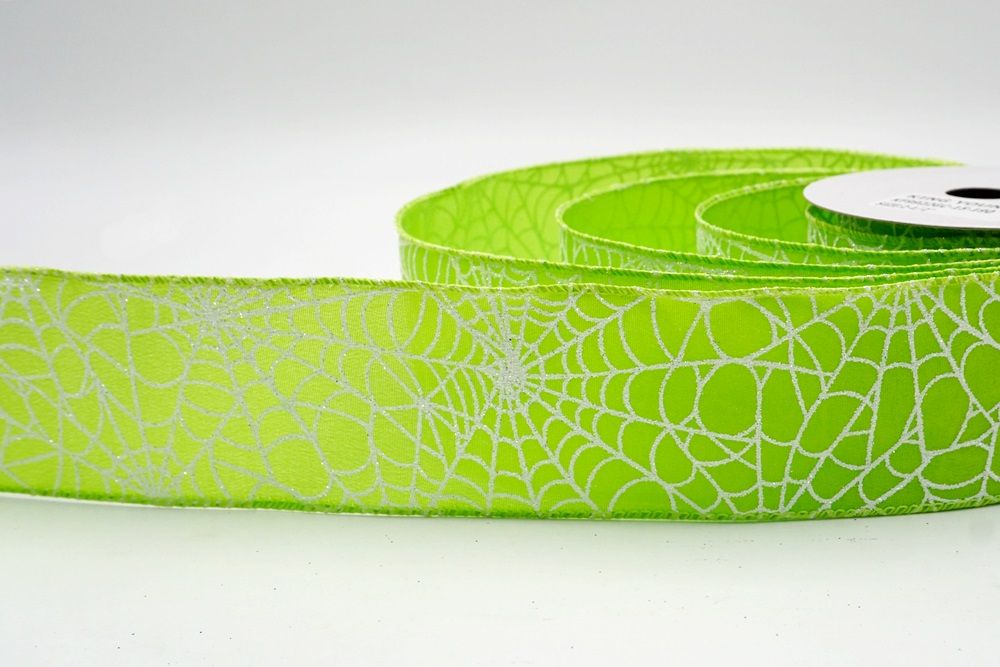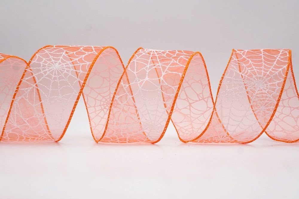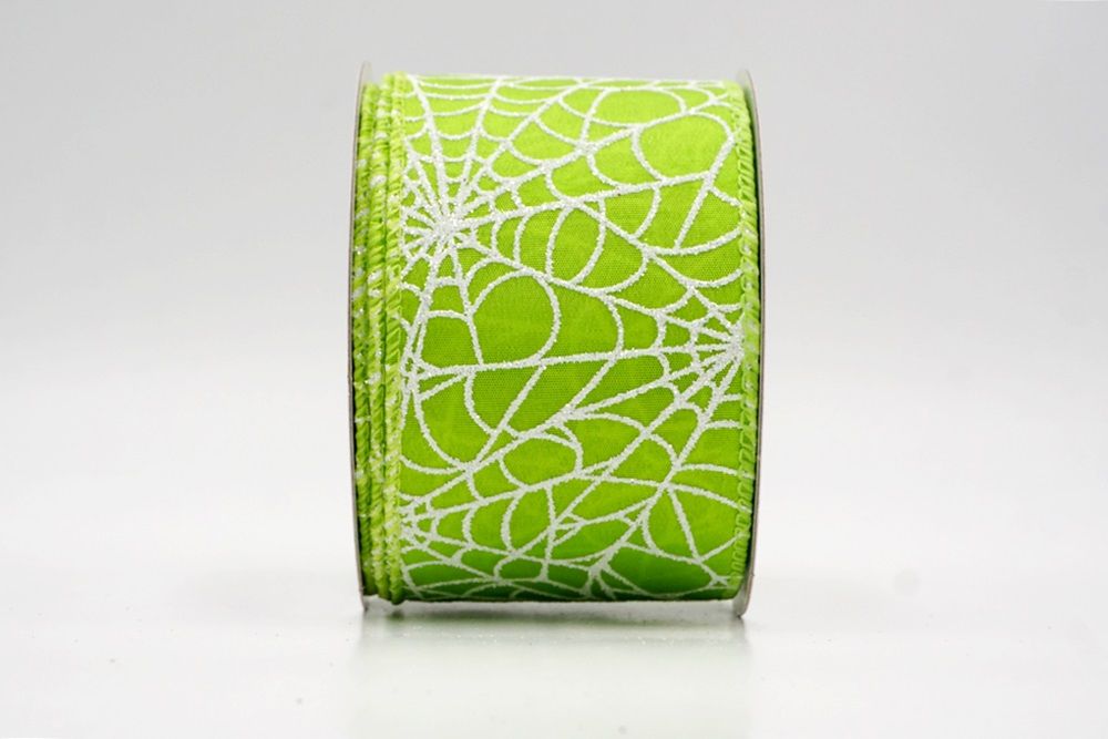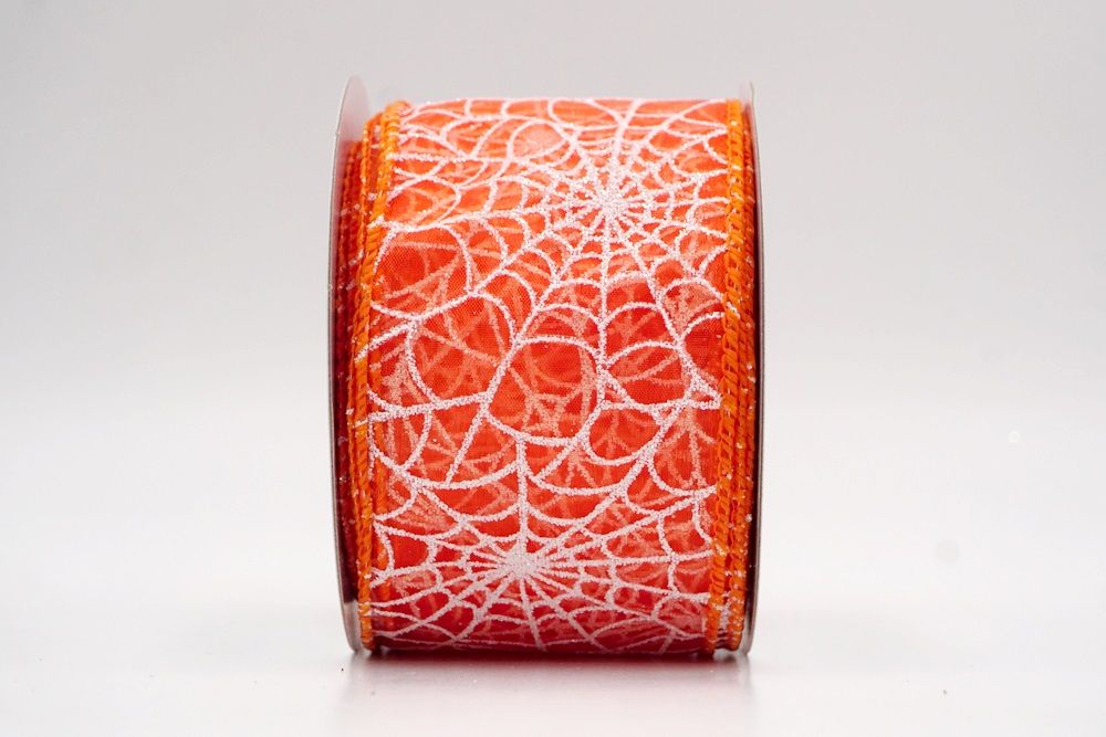 A szalagon látható vizuális elemek egy részletes és kissé ijesztő pókháló mintázatot mutatnak, amelyet fémes csillogás egészít ki. A szalag teljes felületét egy finom fehér hálós minta borítja, amely úgy néz ki, mint a finom csipke. Ez a webmintázat gyakran fényes, csillogó felülettel van nyomtatva, ami a szalagnak egy észrevehető csillogást kölcsönöz, mintha harmattal vagy fagyottal lenne borítva. Ez a csillogó hatás különösen figyelemfelkeltő a áttetsző anyagon, ahol a háttérszín átsüt a transzparens anyagon. A zsákvászon verzión a webes minta tisztán kiemelkedik a szilárd, texturált alap színnel szemben. Mivel a szalagban beépített drótél található, könnyen formázható drámai, szélfútta alakra, és szorosan rögzíthető. A drót lehetővé teszi a készítő számára, hogy a szalagot egy ijesztő, strukturált hajtást adjon, amely végig megőrzi formáját a rémisztő szezon során.