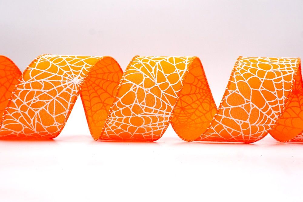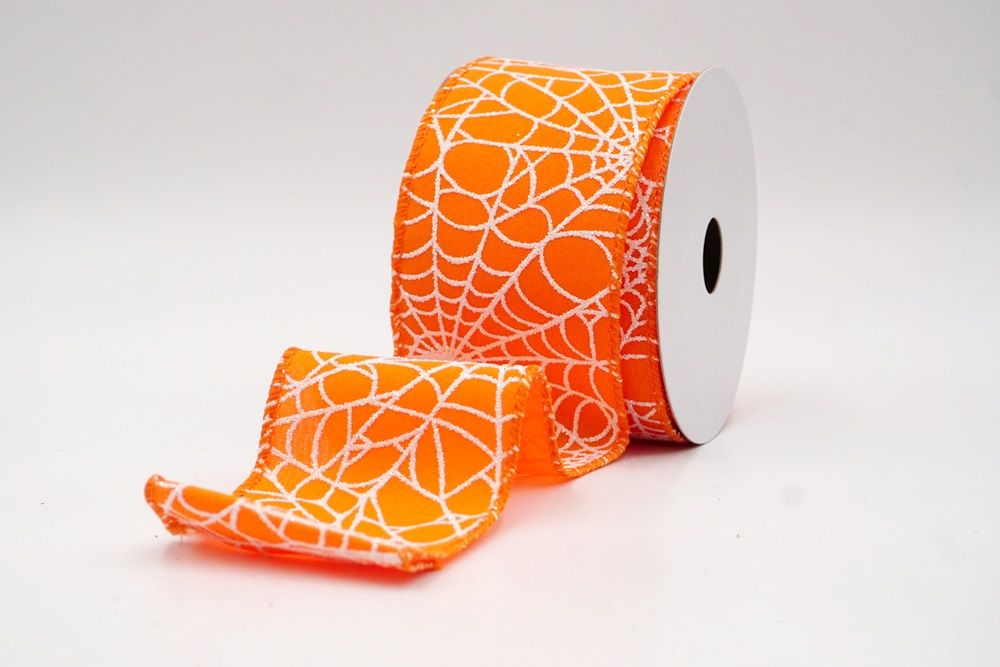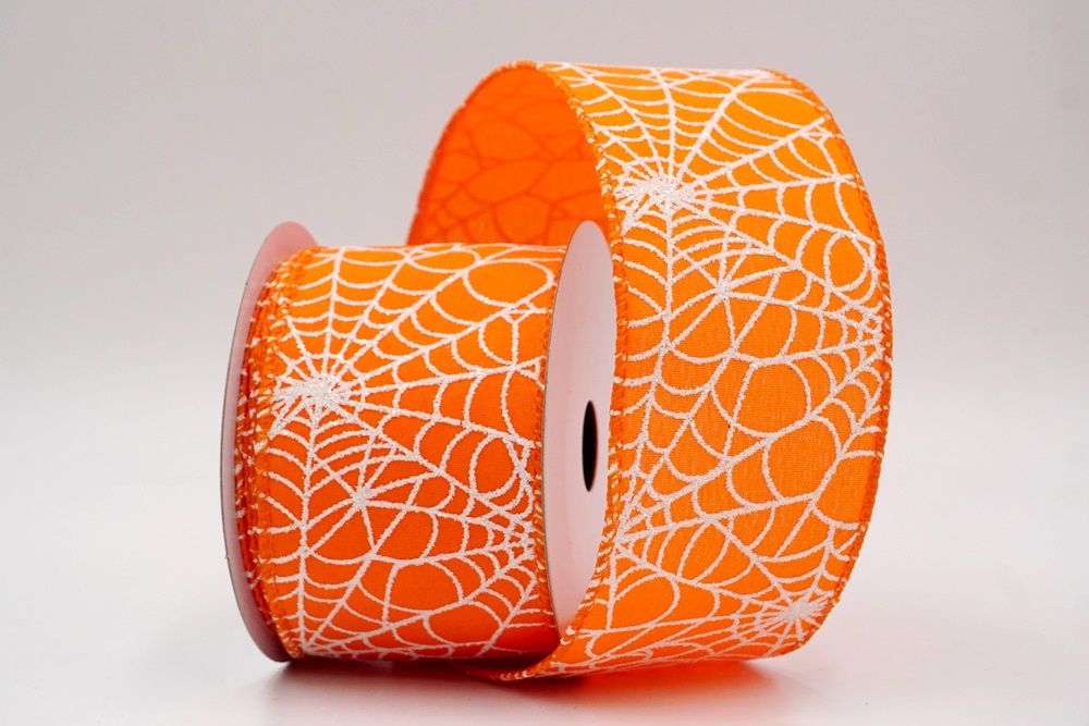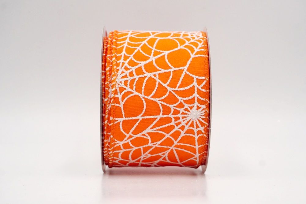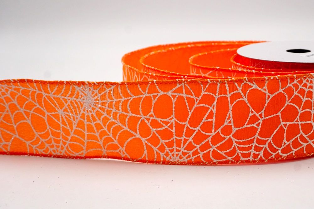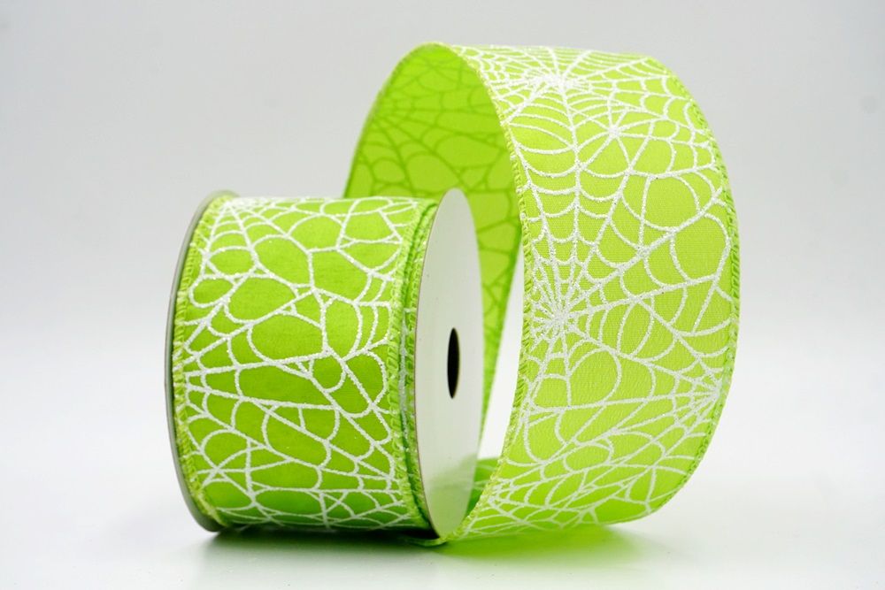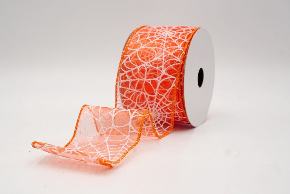 A szalagon látható vizuális elemek egy részletes és kissé ijesztő pókháló mintázatot mutatnak, amelyet fémes csillogás egészít ki. A szalag teljes felületét egy finom fehér hálós minta borítja, amely úgy néz ki, mint a finom csipke. Ez a webmintázat gyakran fényes, csillogó felülettel van nyomtatva, ami a szalagnak egy észrevehető csillogást kölcsönöz, mintha harmattal vagy fagyottal lenne borítva. Ez a csillogó hatás különösen figyelemfelkeltő a áttetsző anyagon, ahol a háttérszín átsüt a transzparens anyagon. A zsákvászon verzión a webes minta tisztán kiemelkedik a szilárd, texturált alap színnel szemben. Mivel a szalagban beépített drótél található, könnyen formázható drámai, szélfútta alakra, és szorosan rögzíthető. A drót lehetővé teszi a készítő számára, hogy a szalagot egy ijesztő, strukturált hajtást adjon, amely végig megőrzi formáját a rémisztő szezon során.