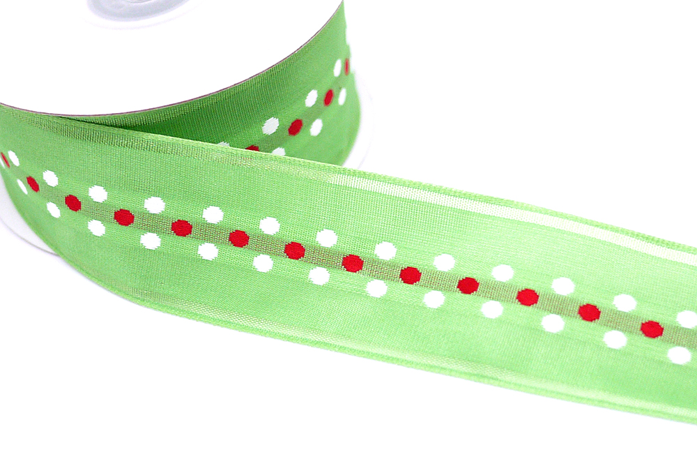 Questa serie è un nastro da 1-1/2 pollici con 2 colori di pois intrecciati al centro.