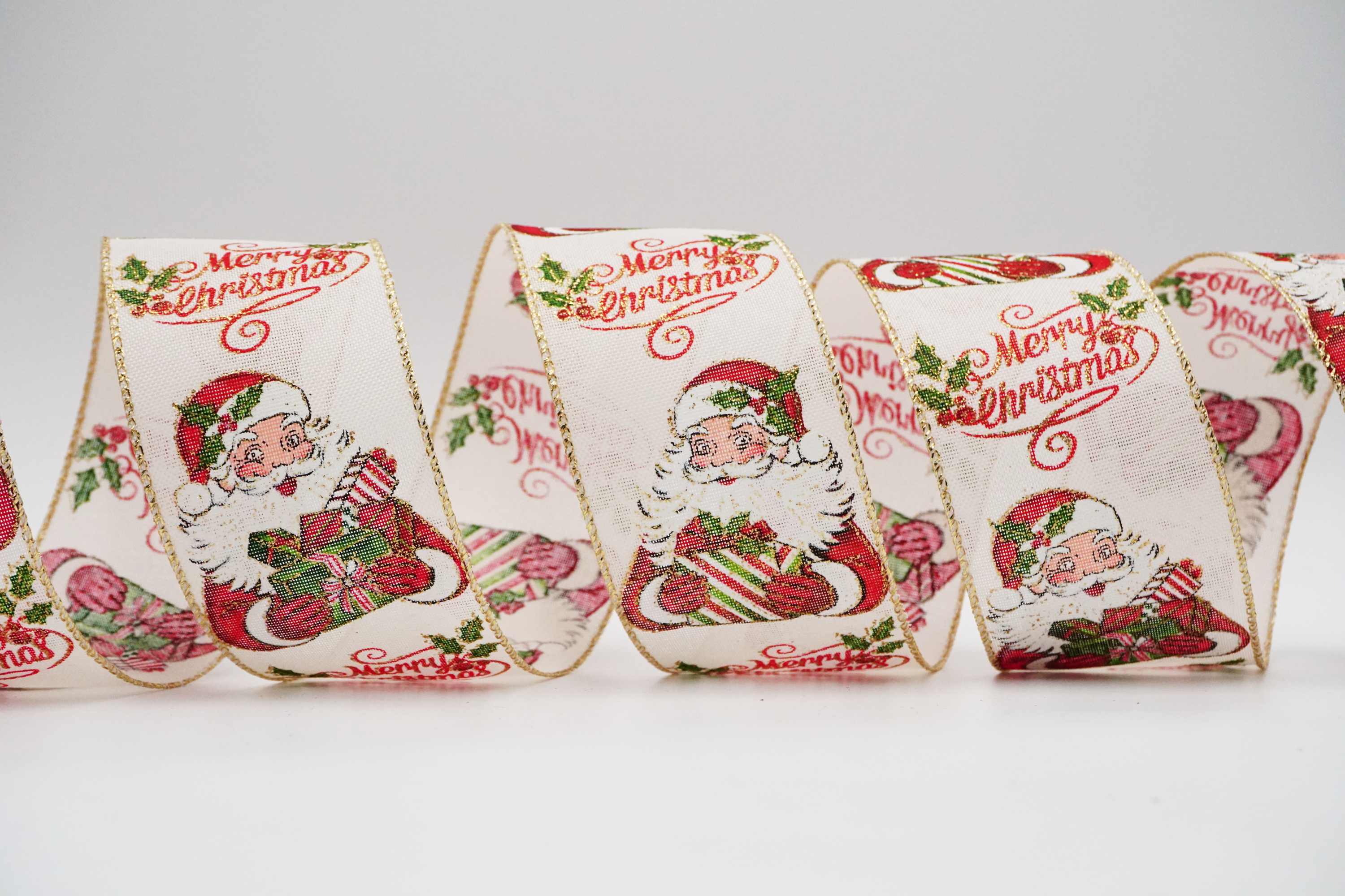 Aggiungi un tocco di magia natalizia ai tuoi regali e altro ancora con un nastro scintillante a tema Babbo Natale. Questa serie di nastri natalizi è larga 2-1/2 pollici e presenta il viso allegro di Babbo Natale che sbircia da una folta barba e un cappello rosso, mentre tiene i regali in mano.