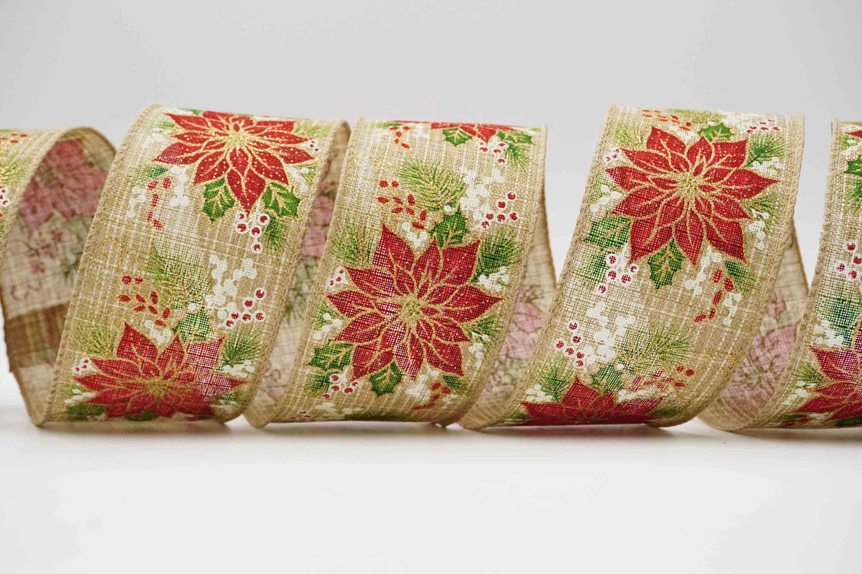 Un design di poinsettia in fiore stampato su nastro di raso e juta sintetica.