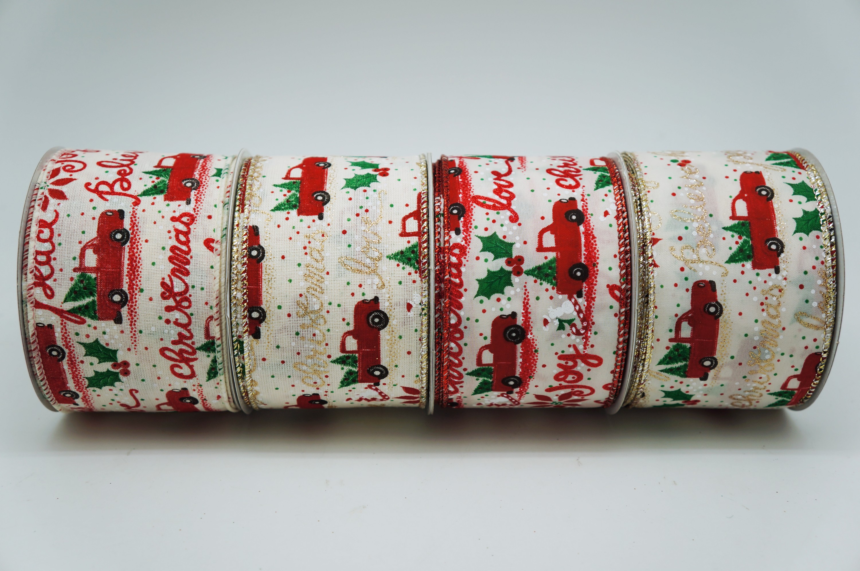 このリボンはクリスマスの要素でいっぱいです!デザインの特徴は古い赤いトラックで、後ろにはクリスマスツリーが積まれています。リボンには「愛」「喜び」「希望」「平和」「信じる」といった英語のテキストが追加されており、赤と緑と白の小さなドット、ヒイラギの葉やベリー、キャンディーケインが飾られています。全体的にクリスマスの雰囲気がとても漂っています。 リボンの両側のエッジにはマットな光沢のコックバインディングが施され、ワイヤーで包まれた縫製により、リボンはさまざまな形状デザインに変化しやすく、変形や損傷が起こりにくくなります。 この懐かしく楽しいデザインパターンは、あなたの気分を明るくし、このリボンがあなたのクリスマスギフト包装、クリスマスツリー、装飾品、リボン、花輪、ホームデコレーションなどに祝祭の雰囲気を加えます!