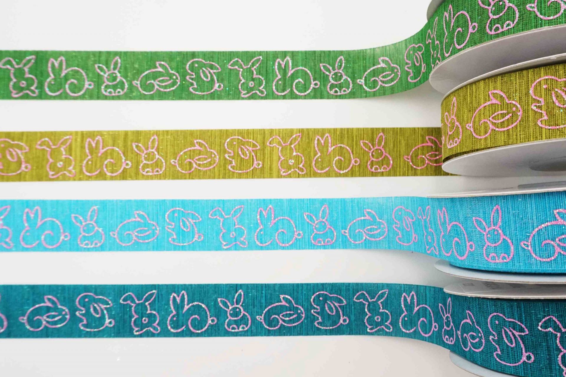 このリボンはイースターバニーを特徴としており、さまざまな走ったり跳ねたりするデザインが施されていて、活気に満ちた雰囲気を演出します。さらに目を引くように、白いキラキラしたオニオンを加え、日光の下で魅力的に輝きます。