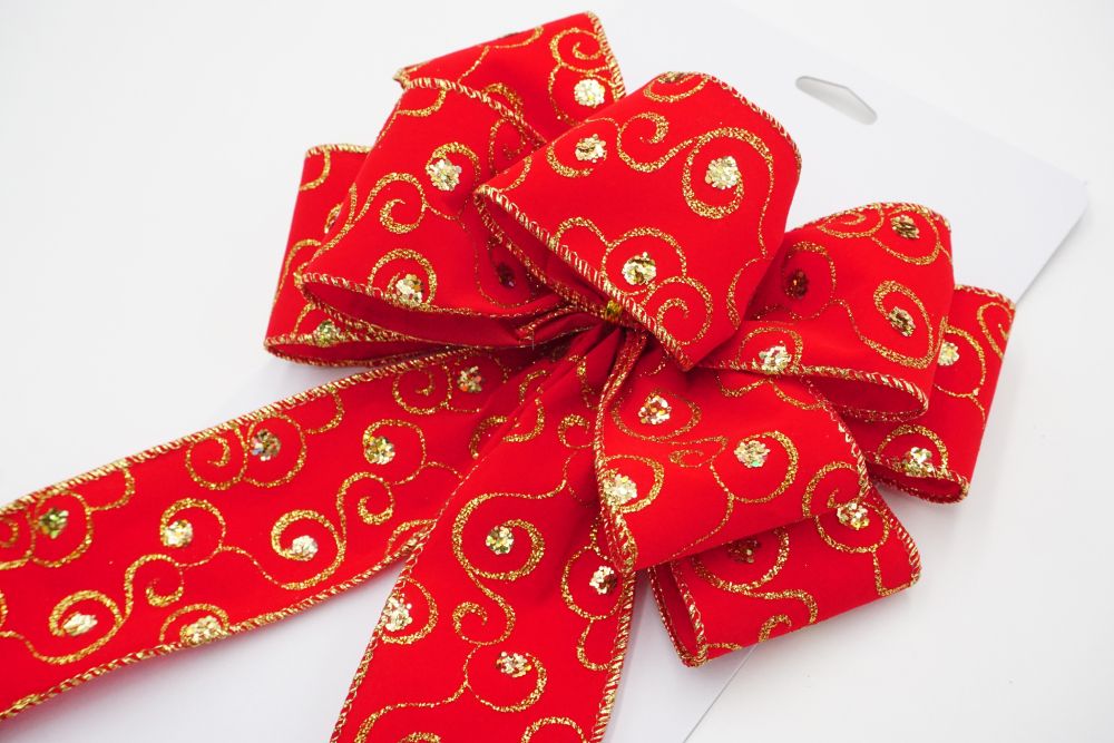 A donis ad coronam, festiva festivitatum ornatus magnos, pulchrosque nodos significat! Hic magnus et elegans nodus classicus est cum rubro velveto traditio et aspectum luxuriosum creavit cum aureis margines decisis. Decem ansae et nasus sunt in toto; quattuor ansae in superiori strato et sex ansae in inferiori. Duo caudae longae et duo caudae breves nodum etiam nobilitant.