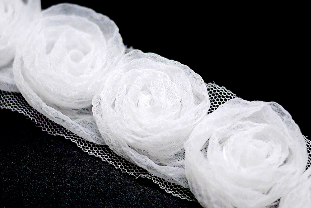 Lorum trim 38mm, quod habet textum album crinkled in forma magnorum rosarum super tulle album. Valde elegans est et optimum ad consuendum ad vestimenta ut trim vel pro tuis artificiis, decoris domus et plura. Qualitas certa.