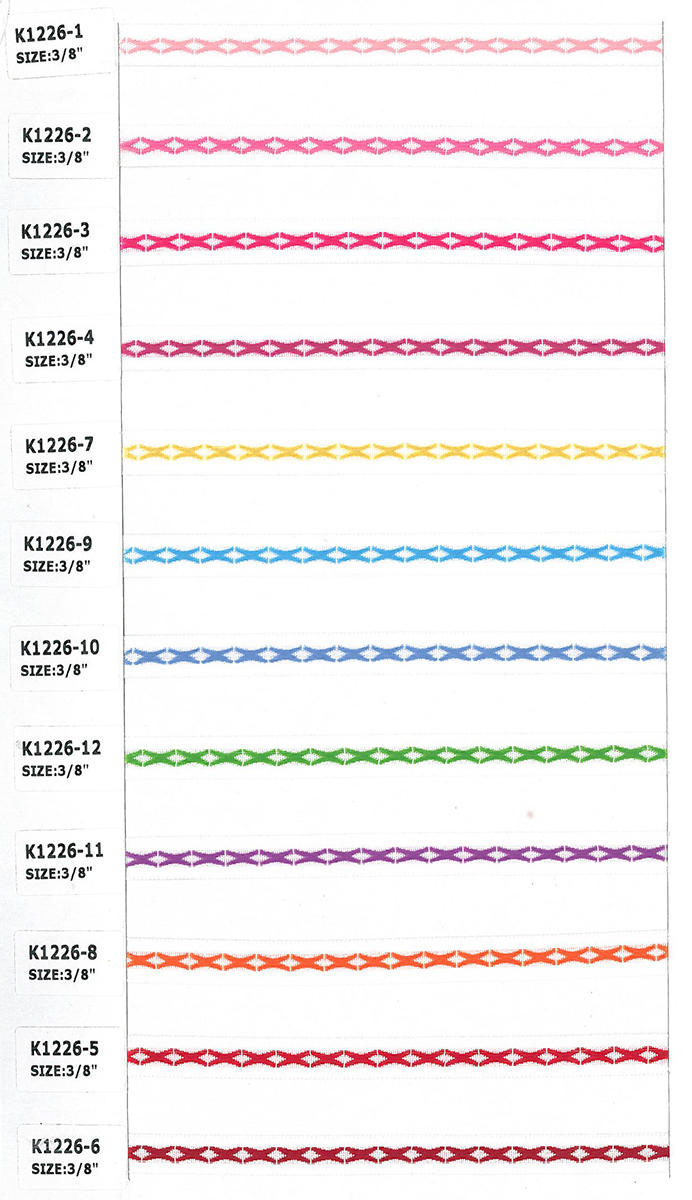 Angusta fasciola in latitudine 3/8 unciae habet texturam "X" in albo fundo contextam. Est fasciola iucunda ad tuas chartulas recolligendas, opera manuales, opera consuendi, crines nodos, ornamenta, munera involucra et plura! Disponitur in 12 coloribus. Colores consueti per rogatum fieri possunt. Margo fasciolae non est filo ferreo.