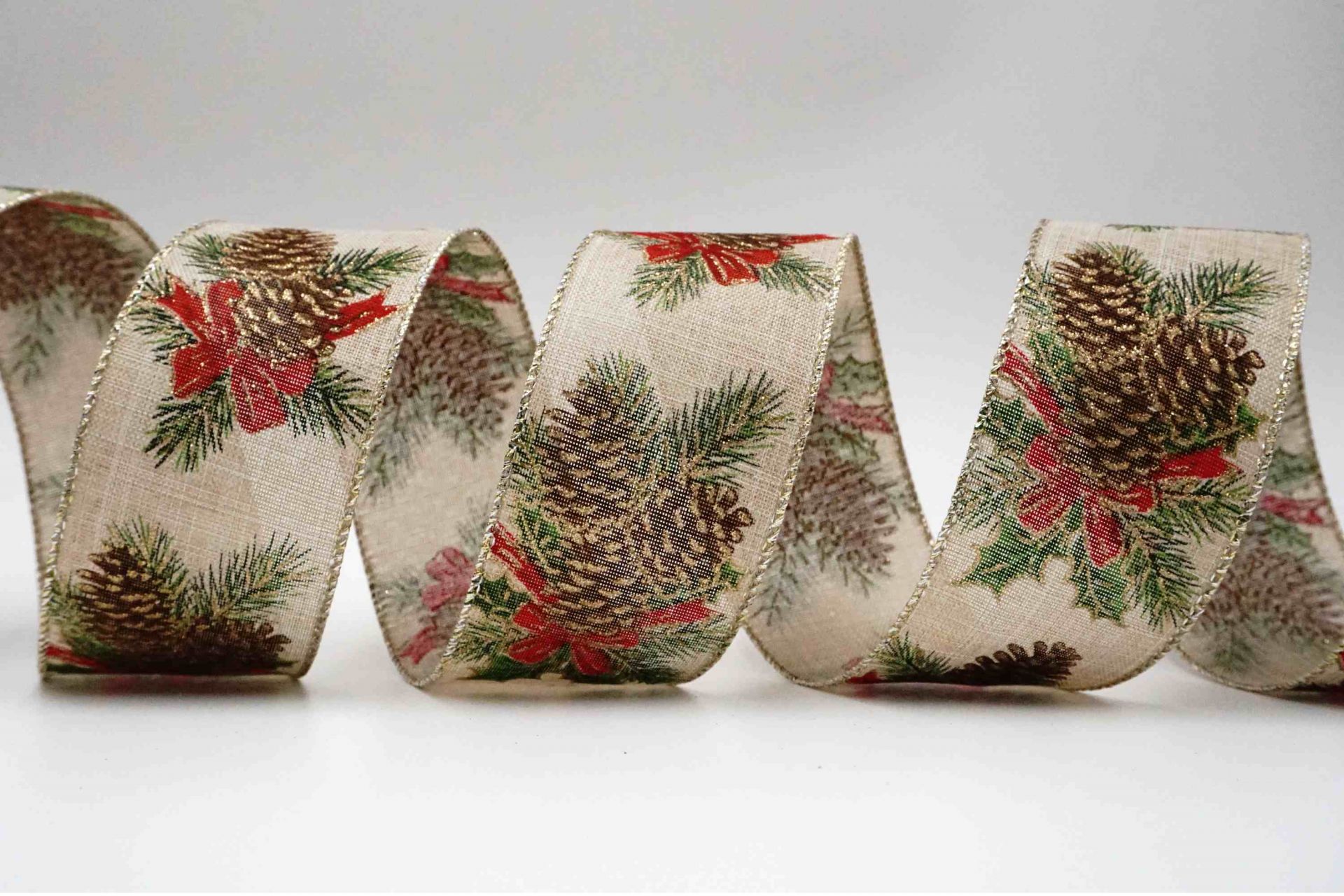 Textile faux burlap cum conis pinii et foliis pinii rubra fascia circumdata