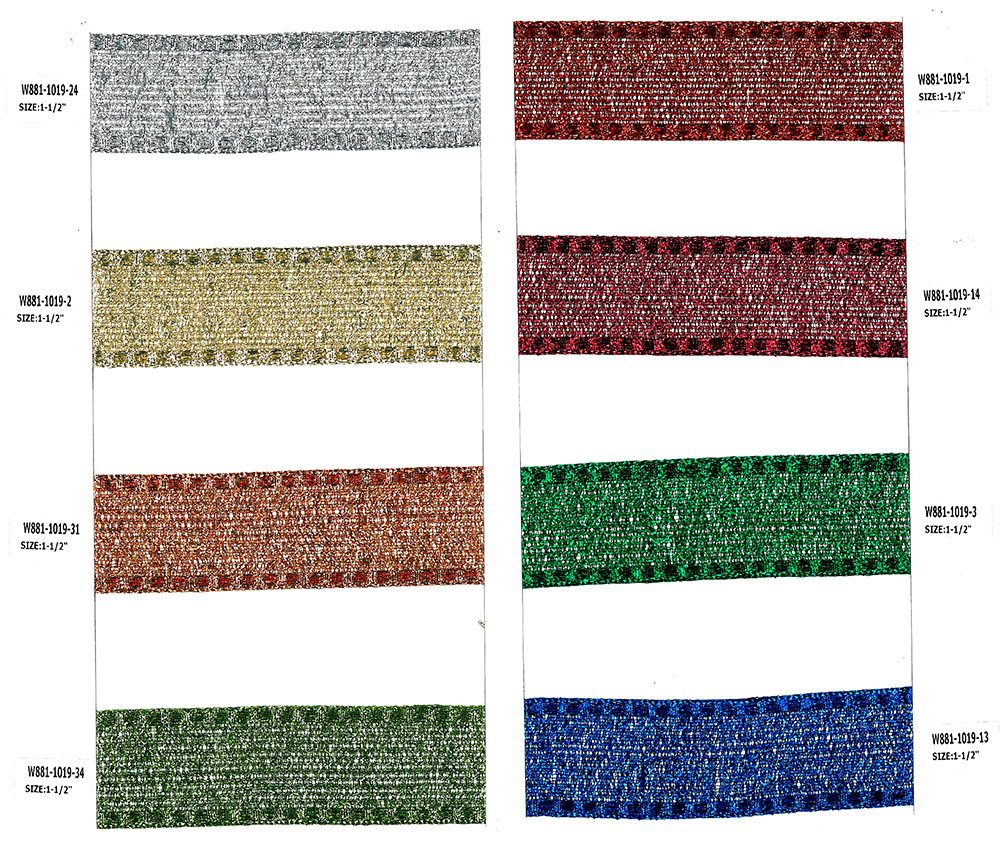 1-1/2 inchum fascinans metallicum textum habet tres lineas subtilis in medio. Margine textus est ligatus ut arcus formam suam teneant. Nunc disponitur in 6 coloribus metallicis fulgentibus. Colores consueti per rogatum disponi possunt. Perfectum est ad Natalem et ad omnes decorationes, arcus, coronas, involucra donorum, dispositiones florales, nuptias et plura.
