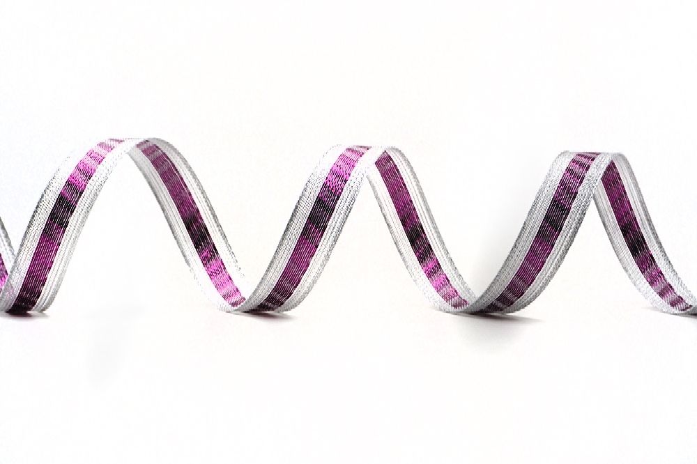 Dit bling metallic smalle lint heeft zilveren metallic strepen in de schering en rand, wat een gestreept uiterlijk creëert. Het gebruikte metallic garen heeft een robuuste uitstraling. Dit lint is verkrijgbaar in 2 breedtes en momenteel in 2 kleuren. Aangepaste kleuren kunnen op aanvraag worden ontwikkeld. De rand is niet gewired. Perfect voor knutselen, haarstrikken, cadeauverpakkingen en alle decoraties waar een vleugje bling nodig is.