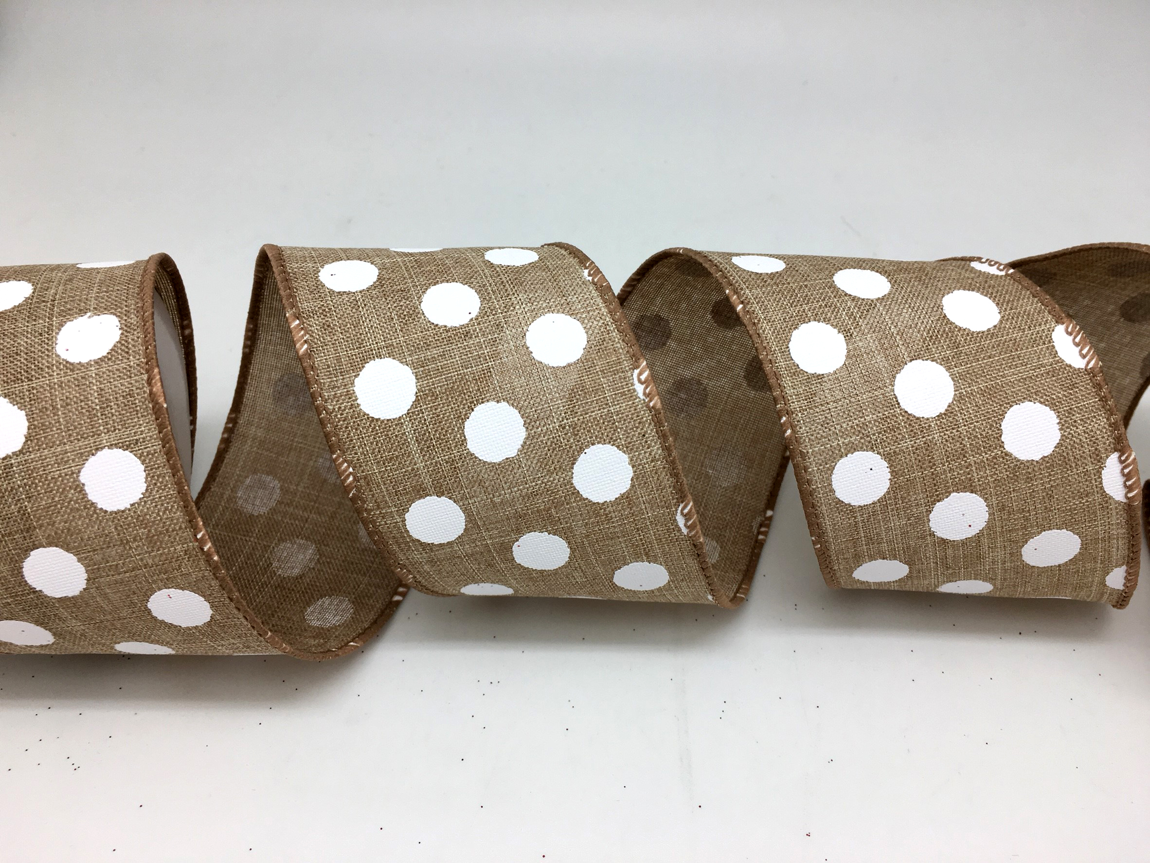 Stippen zijn altijd in de mode! En ze gaan met bijna alles samen! Hier is een klassiek lint met grote witte stippen op een natuurlijke gekleurde nep-jute stof.