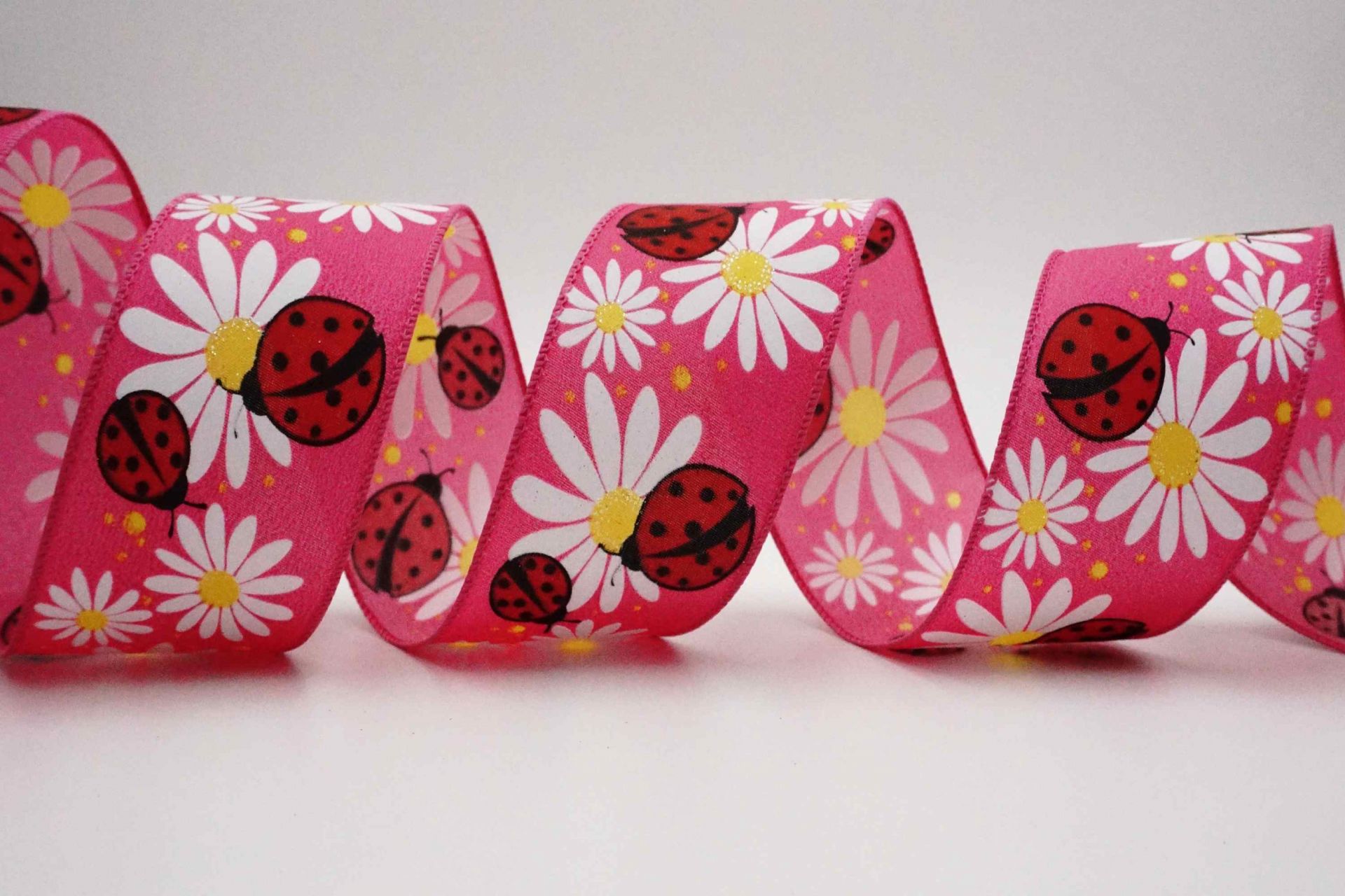 Deze lieveheersbeestje op kamille lint komt met felgele, paarse en felle roze taffeta stoffen. De bloemen met gele centra en smalle, witte bloemblaadjes worden bezet door grote en kleine lieveheersbeestjes. De kleuren zien er mooi samen uit en verbinden zelfs het lentethema.