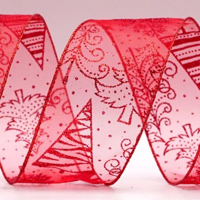 Gewoon weefsel, satijn en transparante stoffen bedrukt met glitter kerstboom patroon om het decoratieve lint op te hangen.