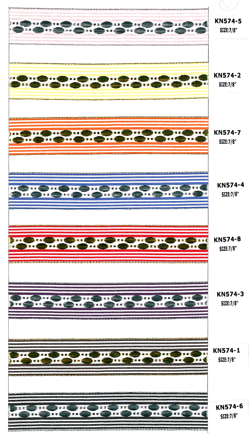 Deze serie is een lint van 1-1/2 inch met 2 kleuren van stippen geweven in het midden.