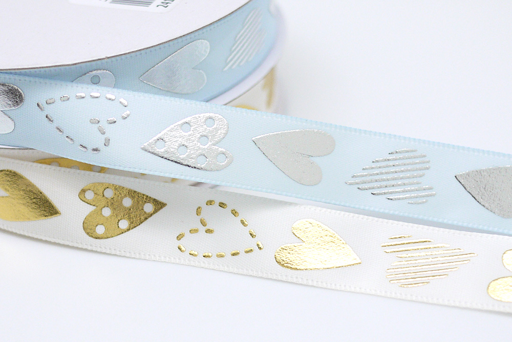 Een 15 mm polyester satijnen lint met verschillende stijlen van harten in goud of zilver erop gedrukt. Je kunt de hartafdruk daadwerkelijk voelen! Aangepaste kleuren kunnen op aanvraag worden gemaakt. Dit bedrukte lint is geweldig voor Valentijns cadeaus, knutselprojecten en cadeauverpakkingen.