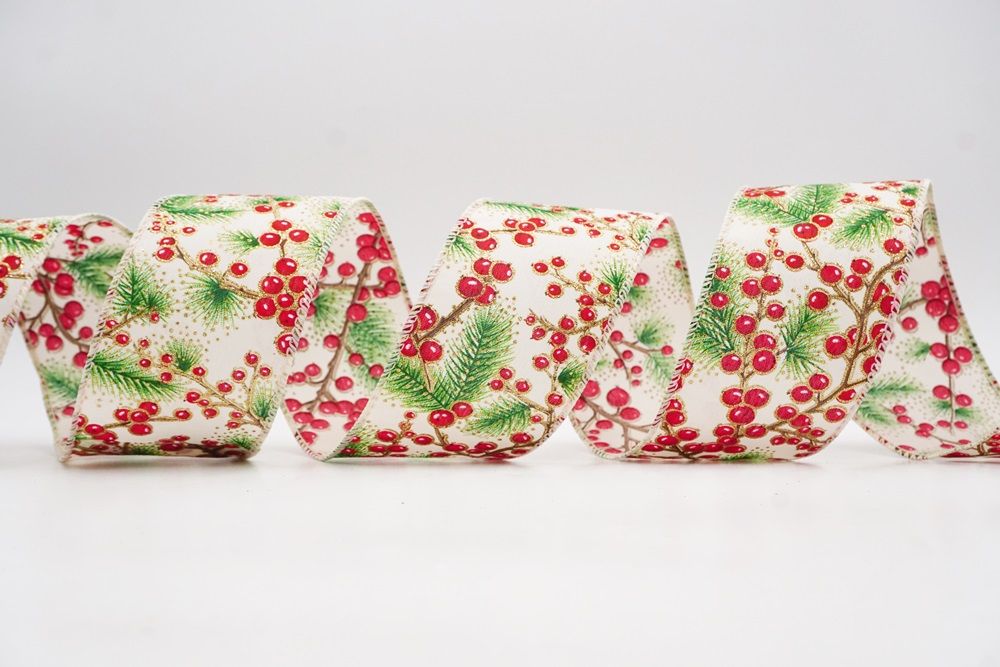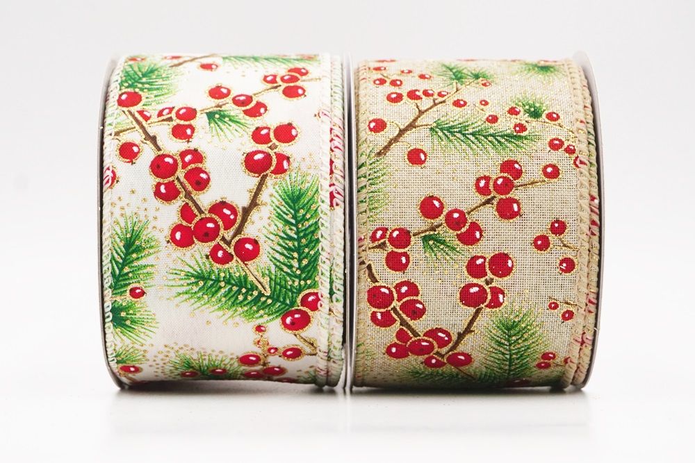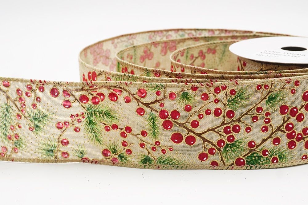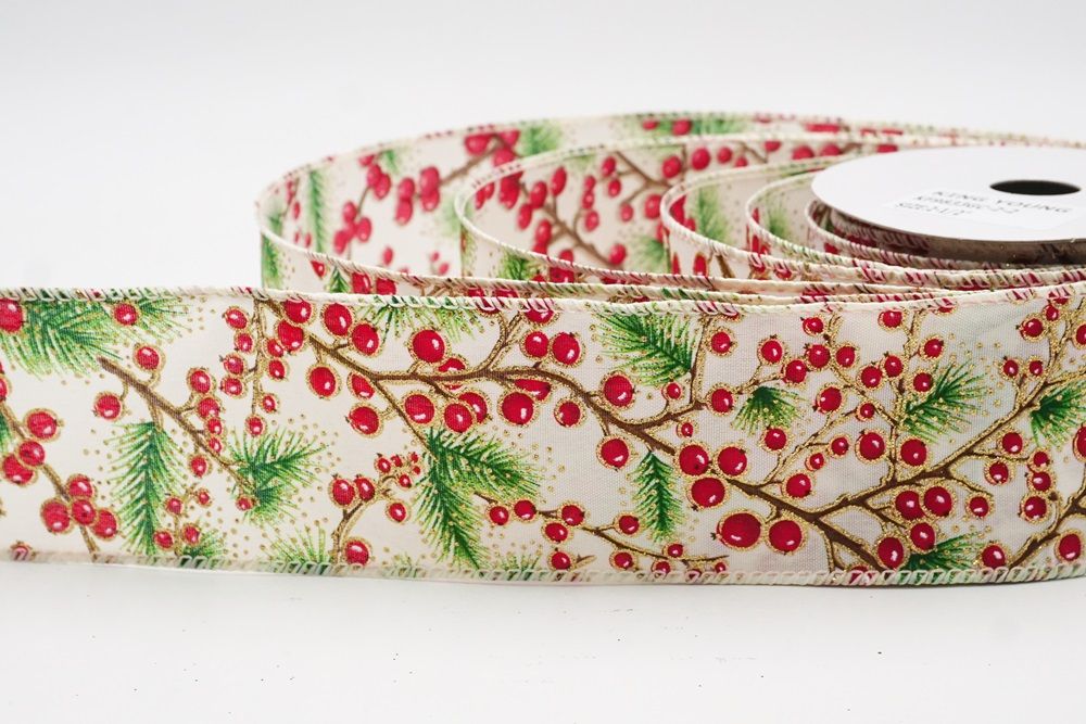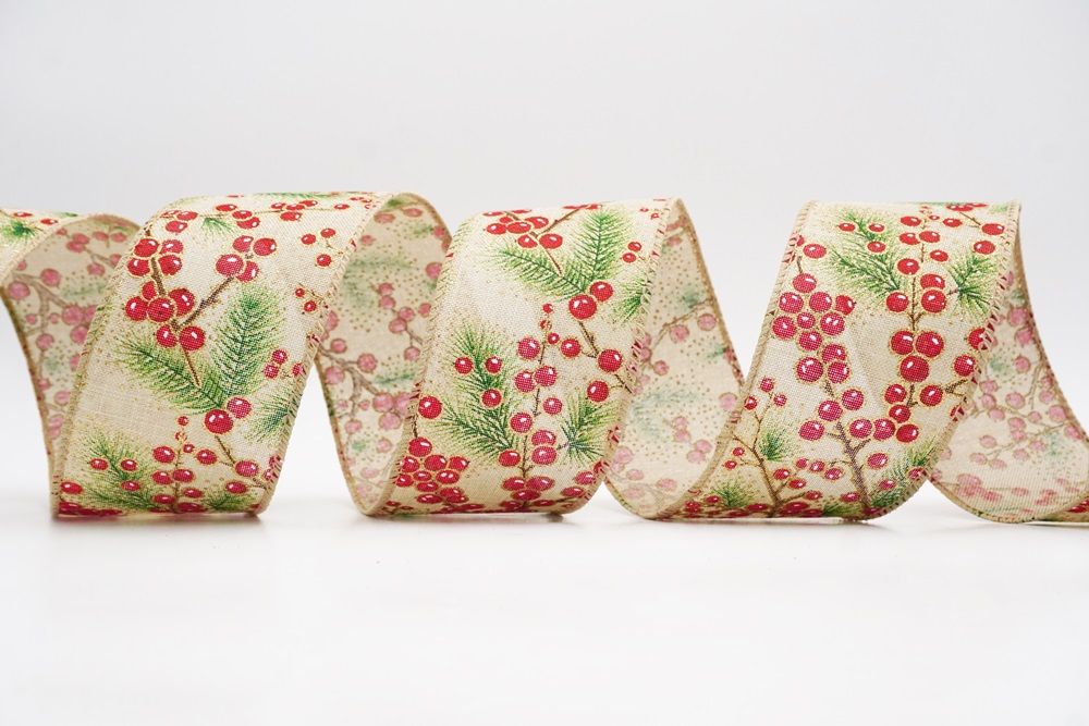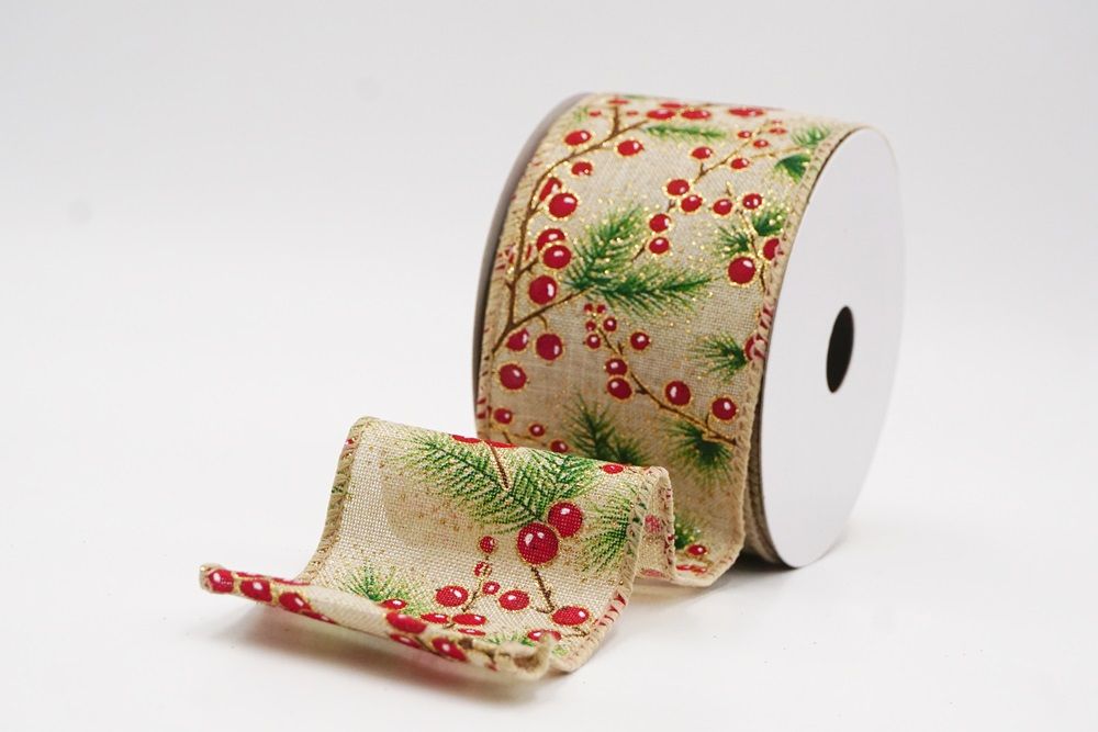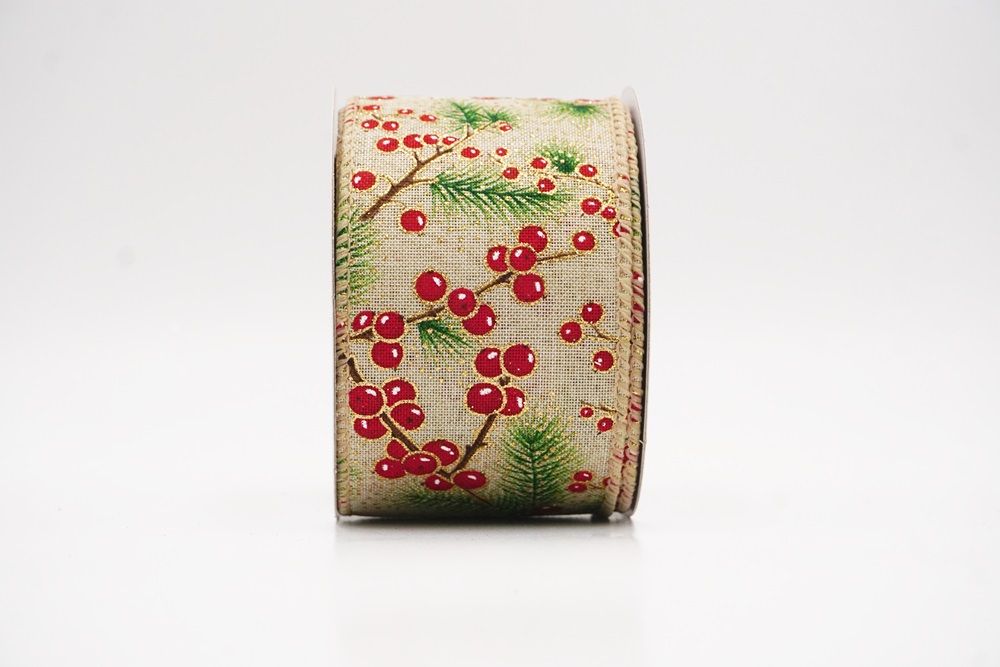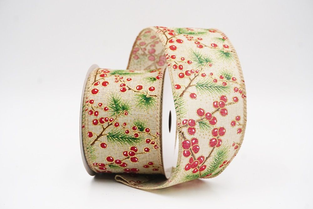 Z pięknie ilustrowanymi gałązkami sosny i czerwonymi jagodami, ta wstążka dodaje naturalnej, zimowej estetyki do dekoracji świątecznych. Dostępna w kolorze kremowym i Lt. Brown, idealnie komponuje się z leśnymi lub rustykalnymi motywami.