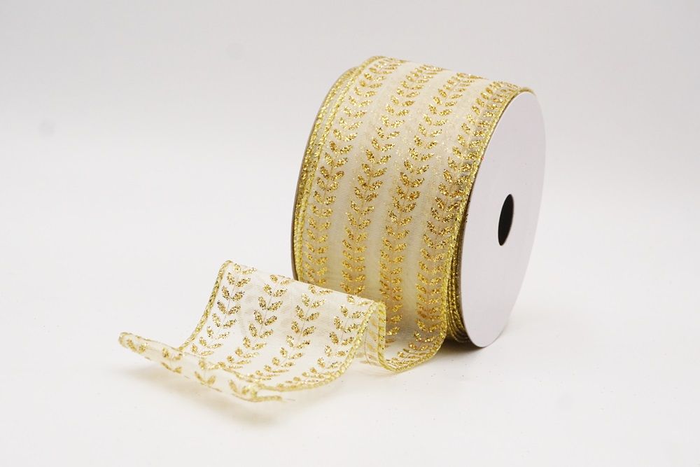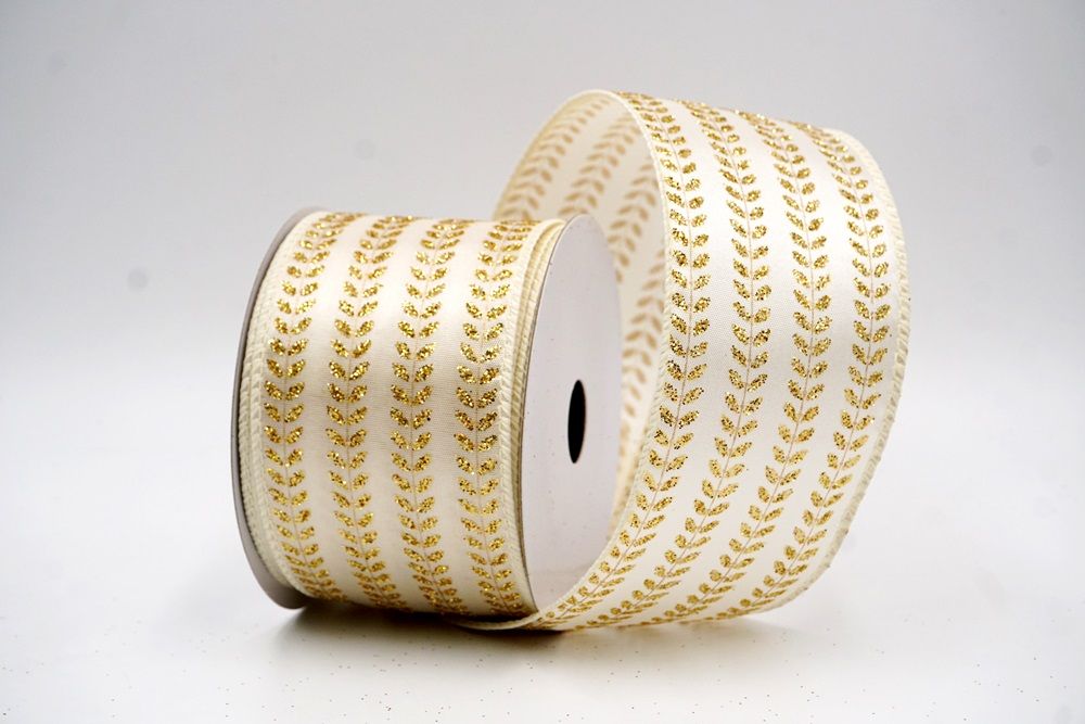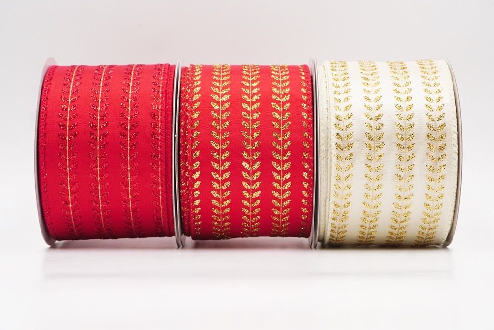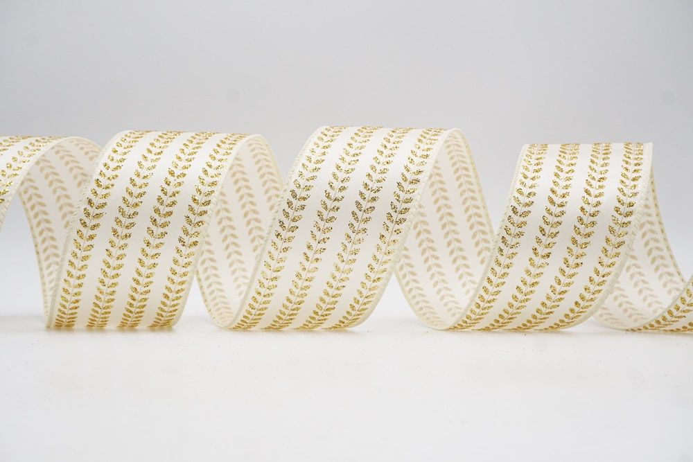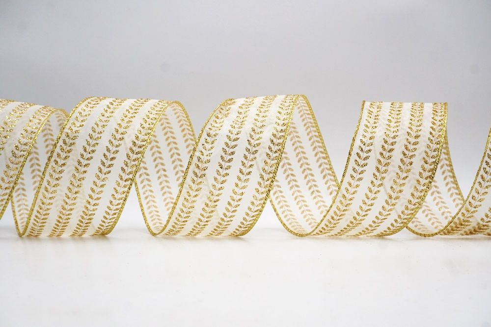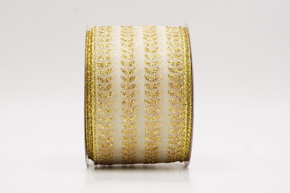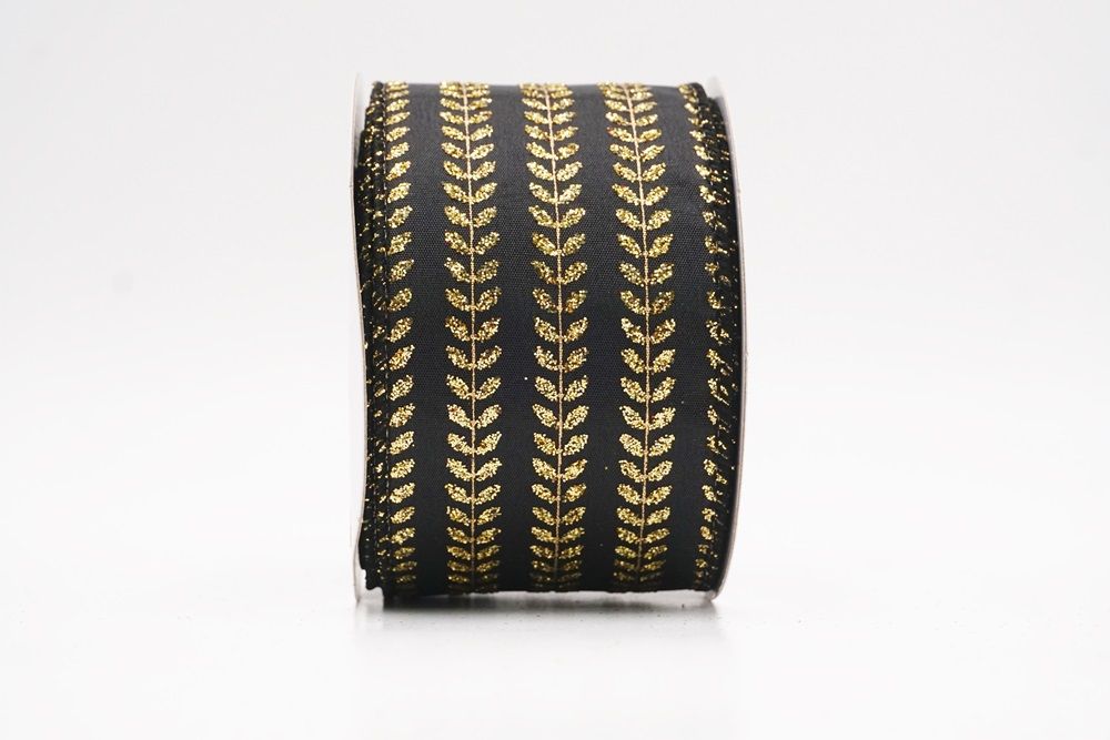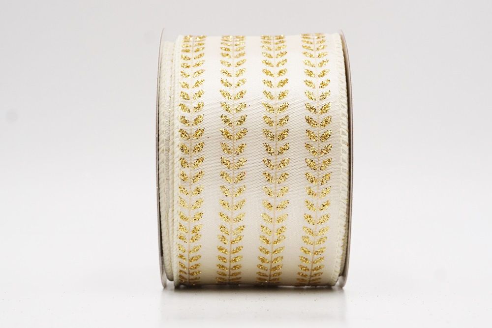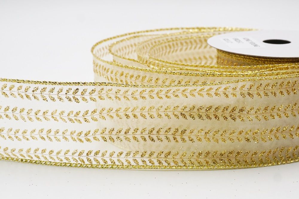 Stylowa wstążka z delikatnymi metalicznymi akcentami w kształcie liści, nadająca elegancki, świąteczny wygląd.