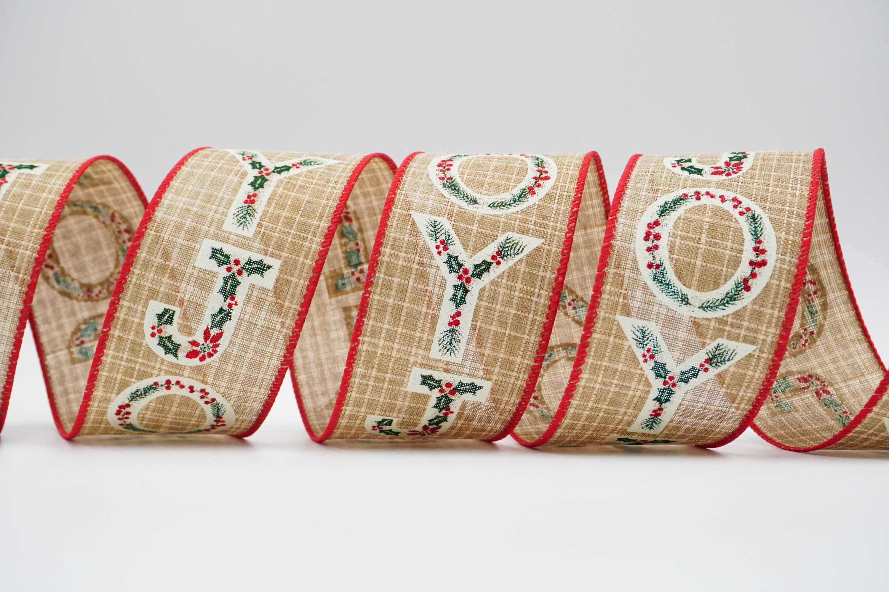To jest piękna wstążka bożonarodzeniowa z nadrukiem. Ma szerokość 2-1/2 cala. Złote litery z brokatem, które tworzą słowo „JOY”, wykonane z wianków, kwiatów bożonarodzeniowych i liści ostrokrzewu, czerwonych jagód. Połączenie sztuki i rzemiosła z kolorami podobnymi do tej wstążki bożonarodzeniowej JOY może nie tylko stworzyć rustykalny krajobraz, ale także budować ciepłe uczucie.