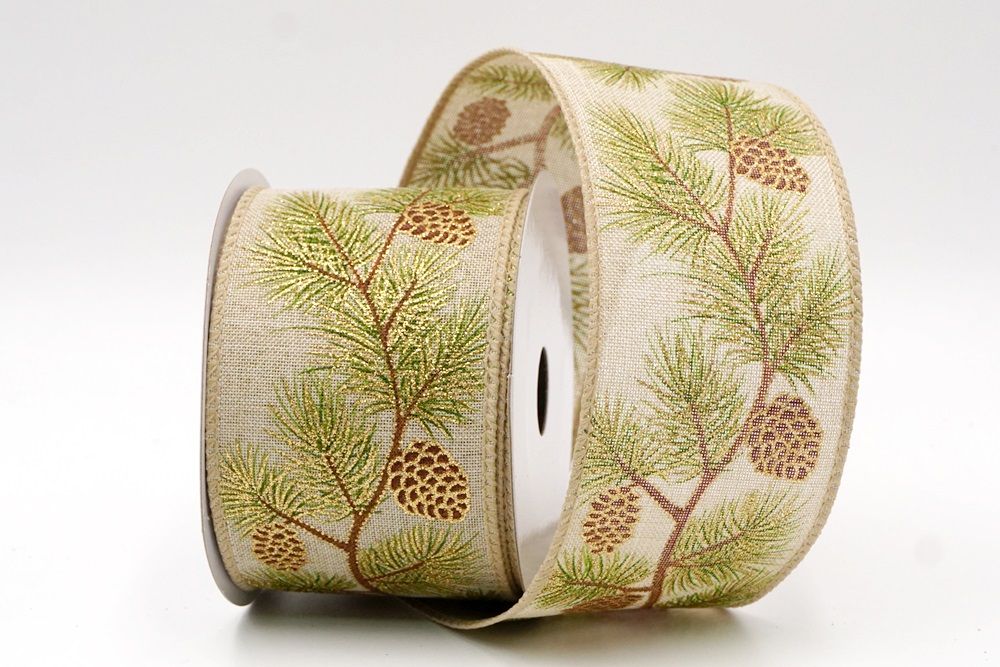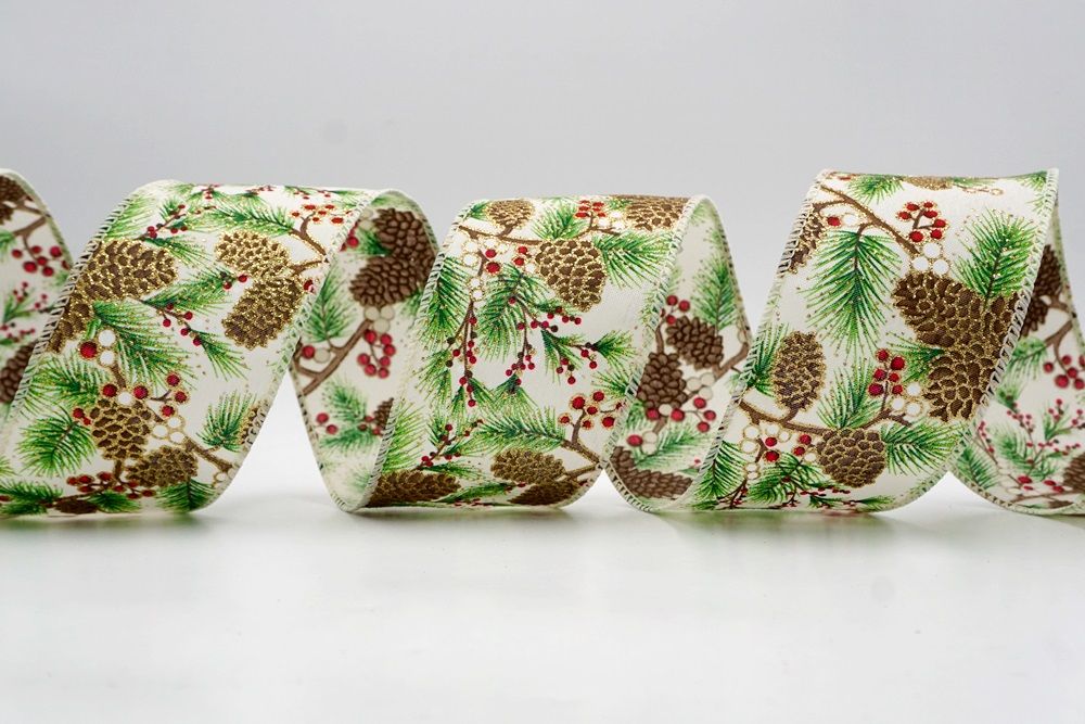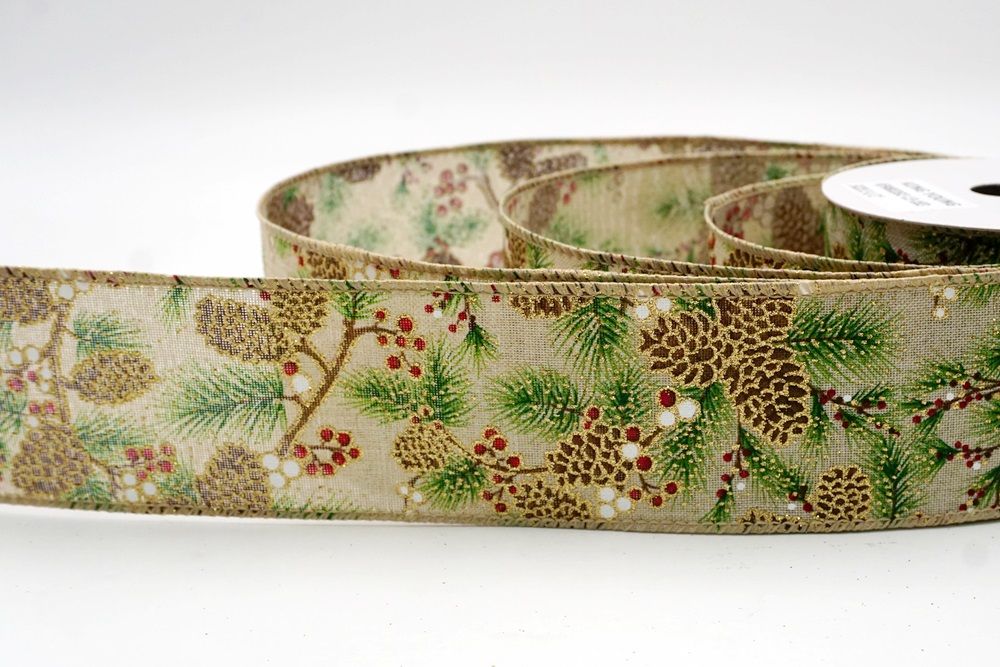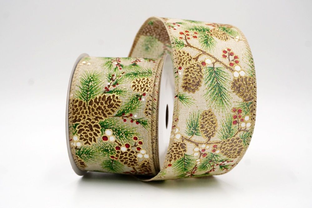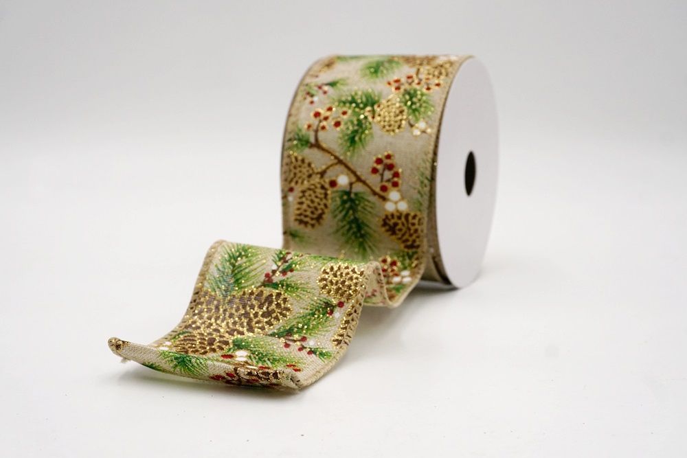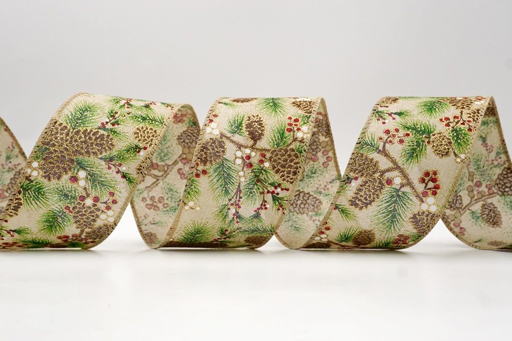 Uchwyć spokojne piękno zimowego lasu z sosnowym szyszką i jagodą wiecznie zieloną. Wstążka druciana. Ten wzór wprowadza na zewnątrz, prezentując szczegółowe gałęzie sosny, teksturowane brązowe szyszki i świąteczne akcenty czerwonych i białych jagód. Umieszczony na neutralnych tłach, takich jak kremowy, biały, khaki i naturalny, materiał przypominający jutę oferuje stonowany, rustykalny wygląd, który pięknie komponuje się z drewnem i zielenią. Błyszczące akcenty na igłach sosny naśladują wygląd porannego szronu, podczas gdy wiecznie zielony wzór przywołuje nostalgiczny zapach świeżej choinki. To projekt, który wydaje się tradycyjny i przytulny, idealny do stworzenia ciepłej, chatowej atmosfery podczas świąt.