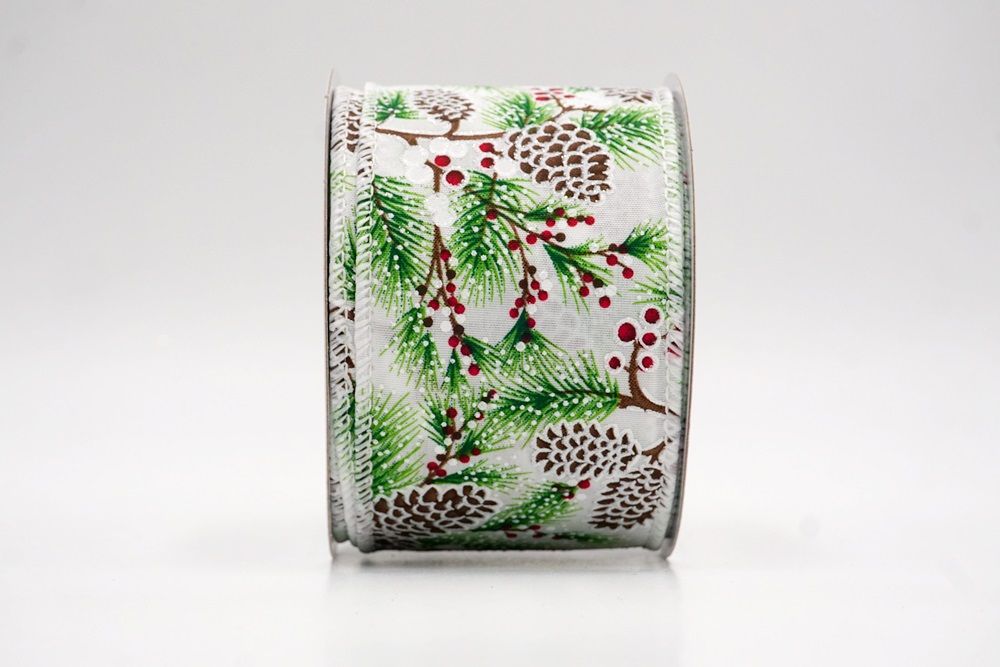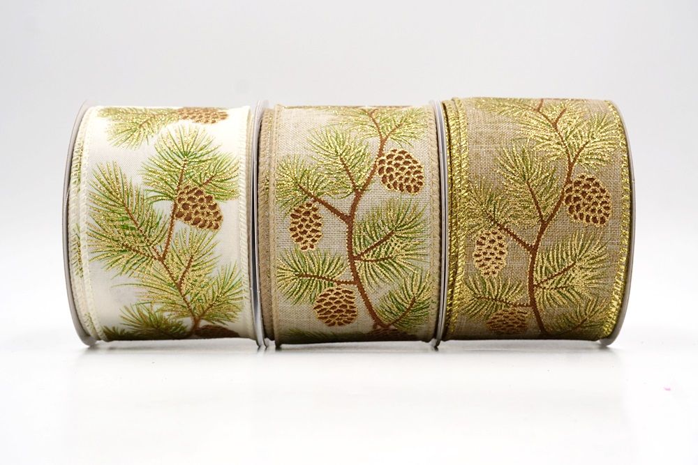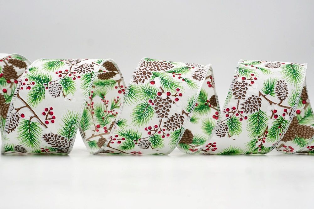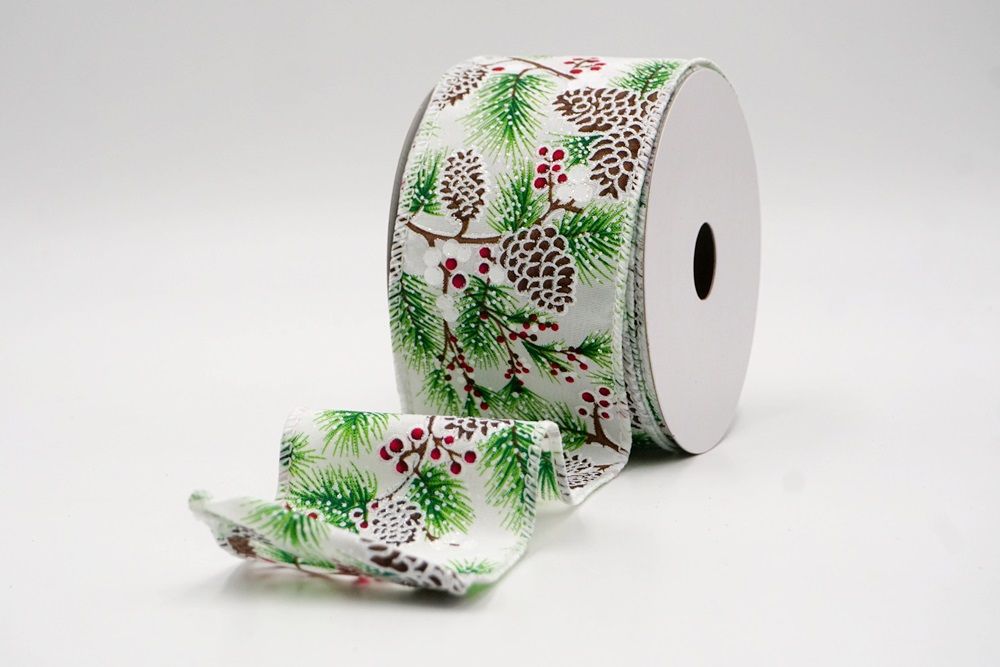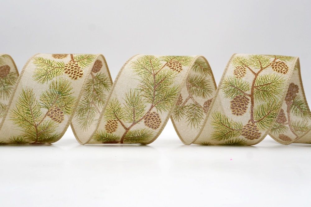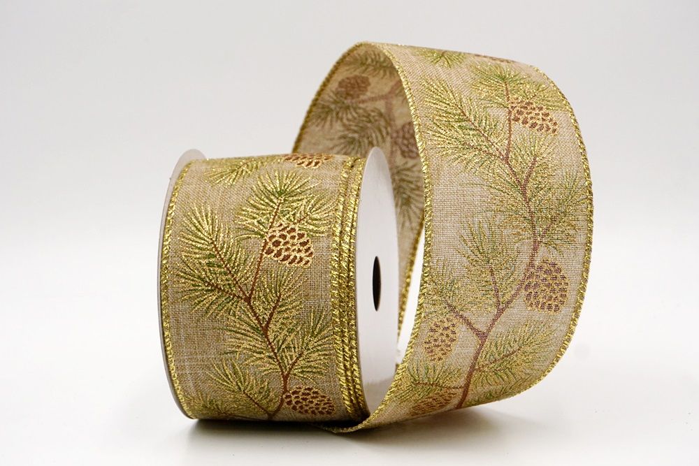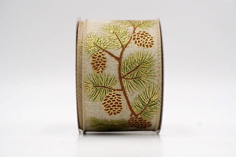 Uchwyć spokojne piękno zimowego lasu z sosnowym szyszką i jagodą wiecznie zieloną. Wstążka druciana. Ten wzór wprowadza na zewnątrz, prezentując szczegółowe gałęzie sosny, teksturowane brązowe szyszki i świąteczne akcenty czerwonych i białych jagód. Umieszczony na neutralnych tłach, takich jak kremowy, biały, khaki i naturalny, materiał przypominający jutę oferuje stonowany, rustykalny wygląd, który pięknie komponuje się z drewnem i zielenią. Błyszczące akcenty na igłach sosny naśladują wygląd porannego szronu, podczas gdy wiecznie zielony wzór przywołuje nostalgiczny zapach świeżej choinki. To projekt, który wydaje się tradycyjny i przytulny, idealny do stworzenia ciepłej, chatowej atmosfery podczas świąt.