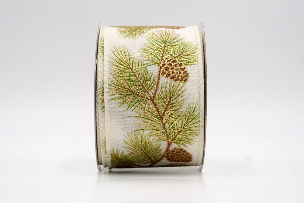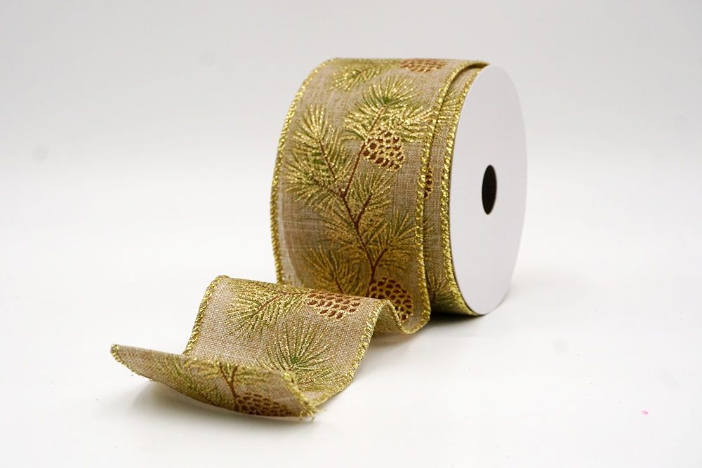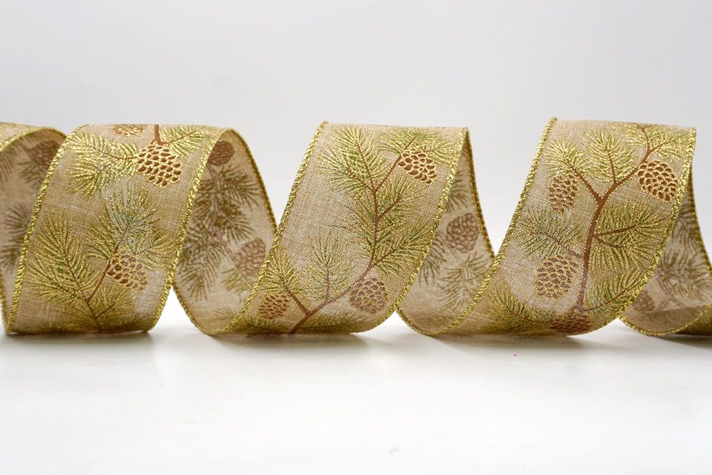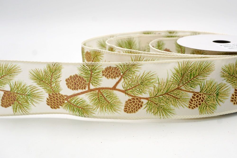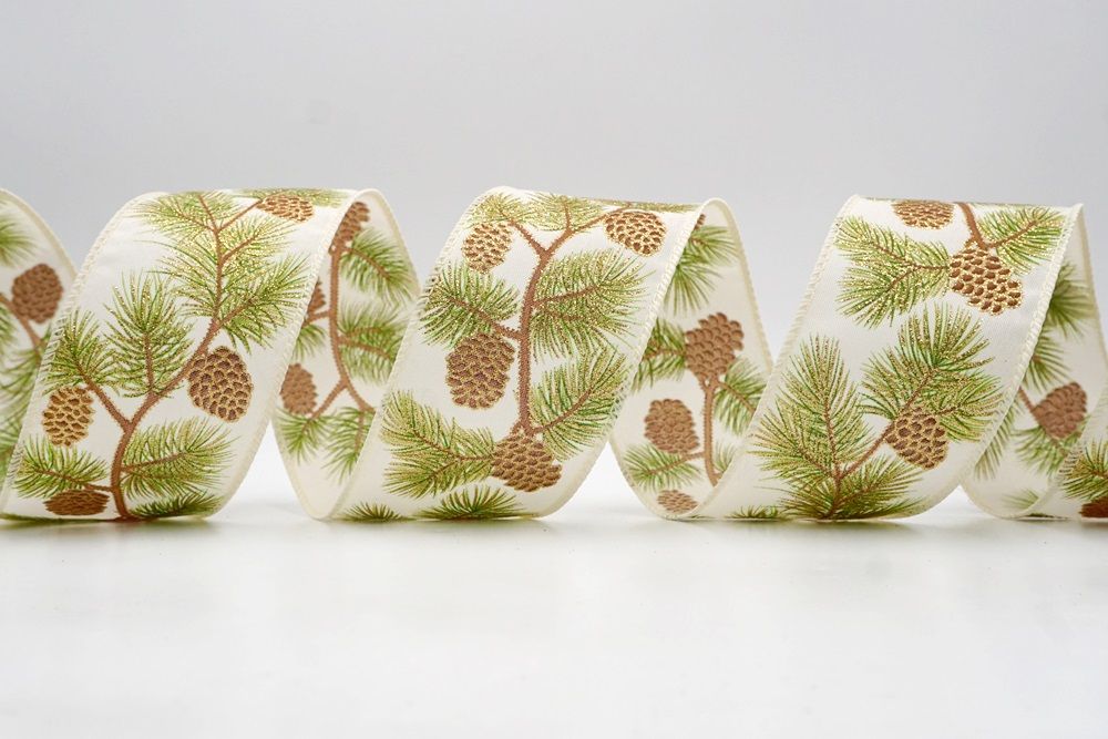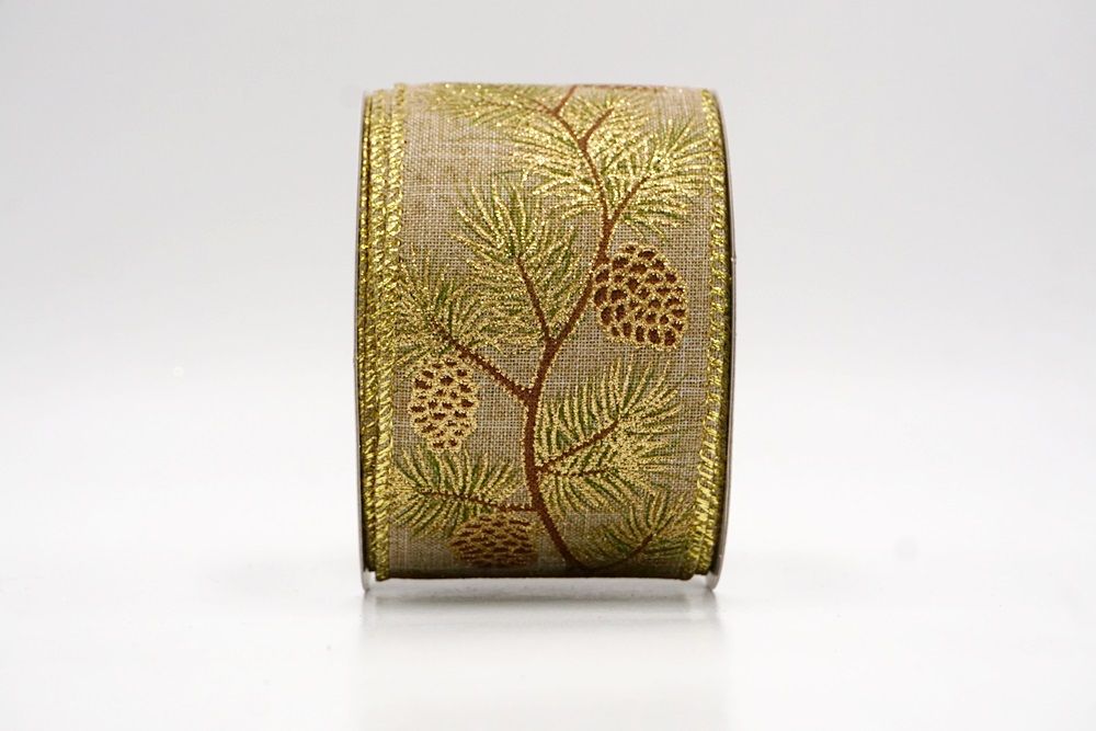 Uchwyć spokojne piękno zimowego lasu z sosnowym szyszką i jagodą wiecznie zieloną. Wstążka druciana. Ten wzór wprowadza na zewnątrz, prezentując szczegółowe gałęzie sosny, teksturowane brązowe szyszki i świąteczne akcenty czerwonych i białych jagód. Umieszczony na neutralnych tłach, takich jak kremowy, biały, khaki i naturalny, materiał przypominający jutę oferuje stonowany, rustykalny wygląd, który pięknie komponuje się z drewnem i zielenią. Błyszczące akcenty na igłach sosny naśladują wygląd porannego szronu, podczas gdy wiecznie zielony wzór przywołuje nostalgiczny zapach świeżej choinki. To projekt, który wydaje się tradycyjny i przytulny, idealny do stworzenia ciepłej, chatowej atmosfery podczas świąt.