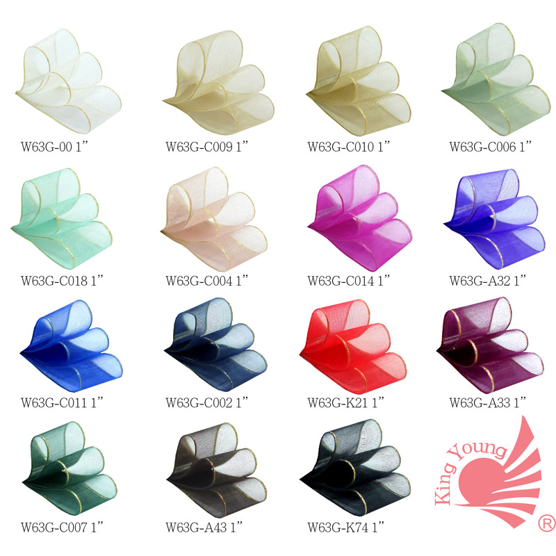 Przezroczysta wstążka poliestrowa na złotym brzegu, dostępna w różnych kolorach.