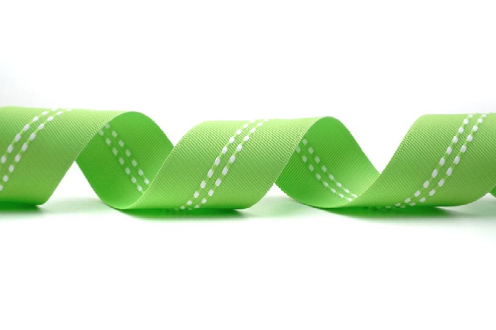 Uma única fileira de pequenos pontos brancos é costurada ao longo das bordas deste estreito laço de grosgrain e pode ser vista em ambos os lados. Os pontos brancos dão um bom contraste ao tecido colorido de grosgrain.