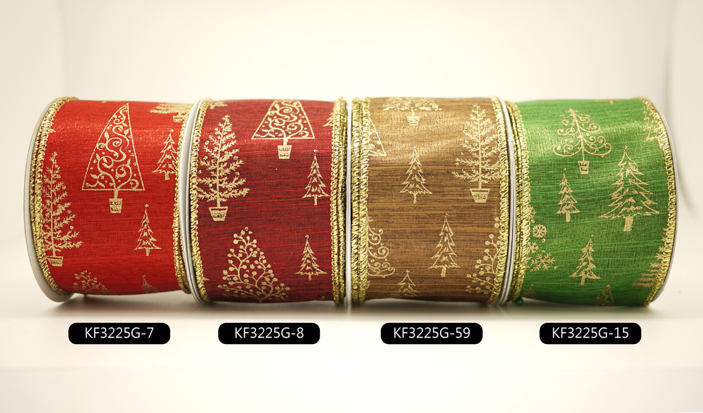 A fita especial de juta falsa com estampa de diferentes tipos de árvores de Natal em dourado. Finos pós dourados e brilhos holográficos dourados são usados para dar brilho a esta fita. A borda da fita é costurada com linha dourada metálica e contém arame para que os laços mantenham sua forma. Ela está disponível em 4 cores de tecido e todos os tamanhos. O design requintado da árvore de Natal torna esta fita uma adição ideal para suas decorações de Natal, laços, guirlandas e embalagens de presente!