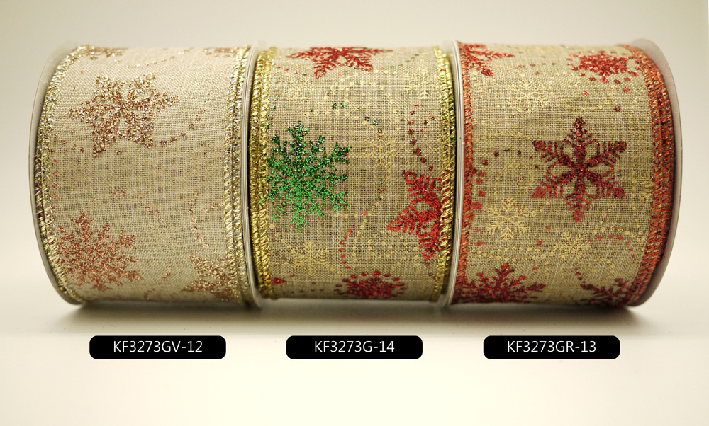 Design de flocos de neve requintados impressos com glitter em tecido de burlap falso cáqui. Acompanhados pelos flocos de neve estão linhas pontilhadas de glitter. A borda da fita é cortada e costurada com fio metálico combinando e contém arame para que você possa dobrar e moldar com facilidade. Está disponível em 3 cores e todos os tamanhos.