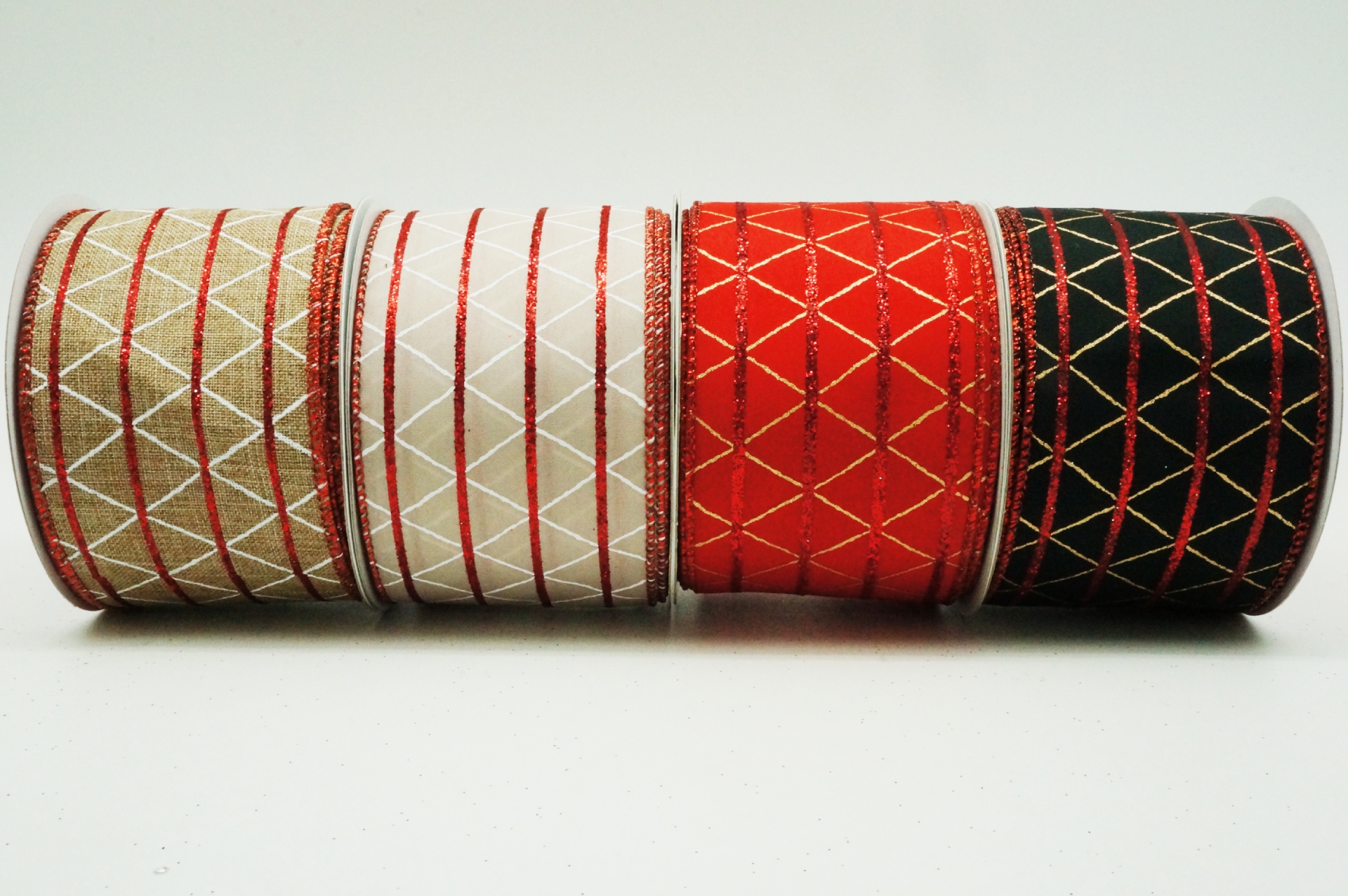 Эта серия геометрических лент имеет красные и бордовые блестящие линии, пересекающиеся с матовыми ромбами либо белого, либо золотого цвета. Она представлена в двух вариантах ткани: полиэстеровый атлас и фальшивая мешковина, и доступна во всех размерах от 1-1/2 дюйма и выше.