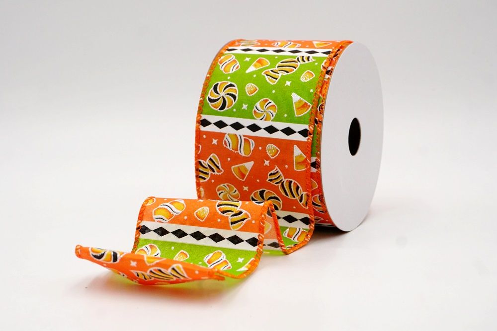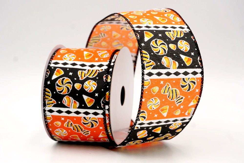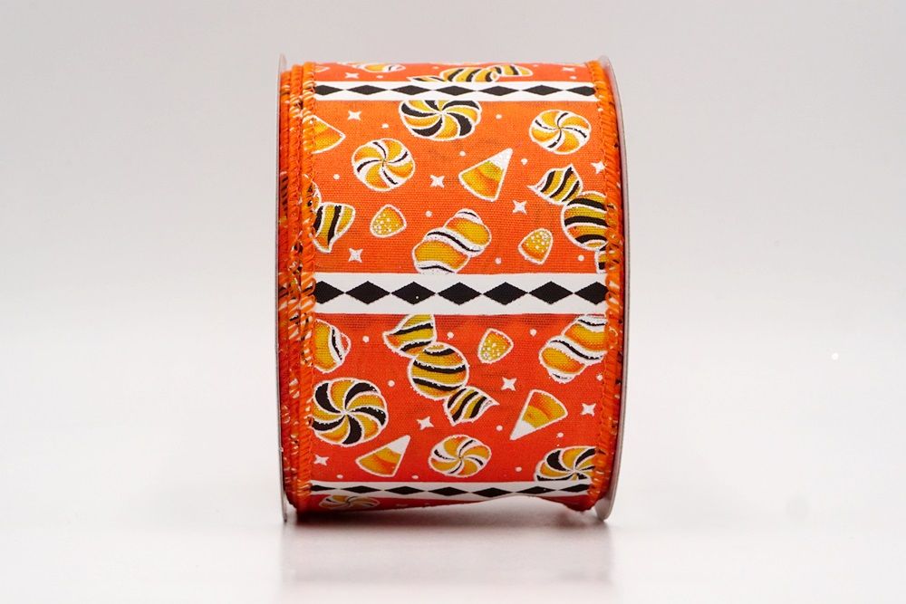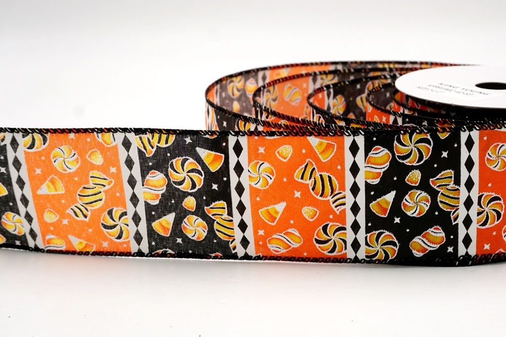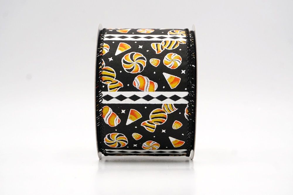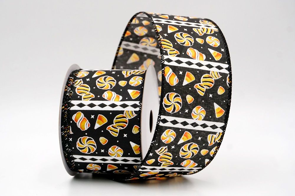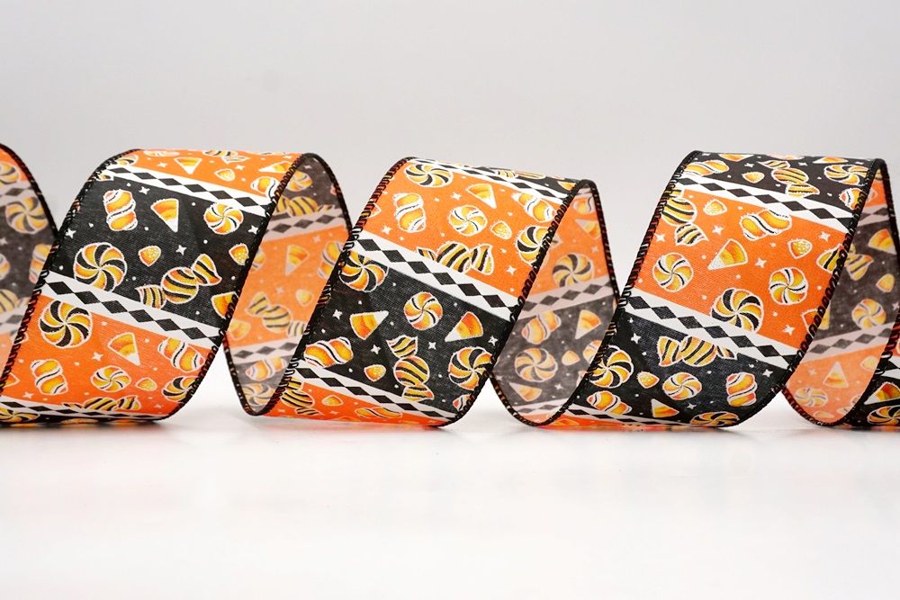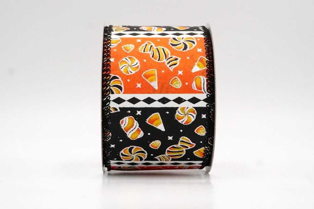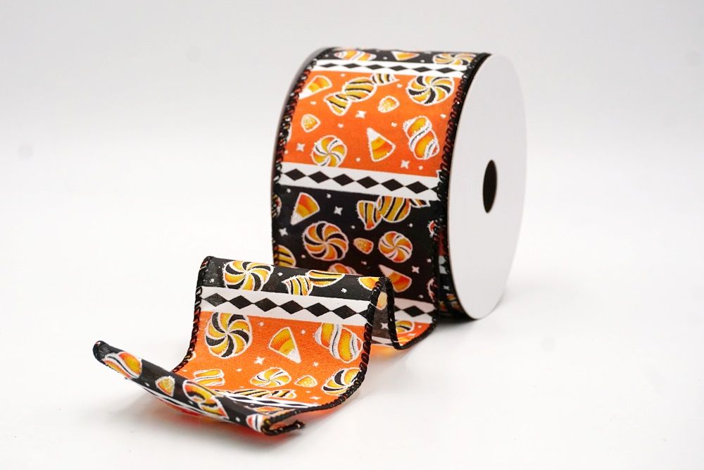 Візерунок на стрічці має дизайн краю, заповнений класичними цукерками для Хелловіна та графічною діамантовою смугою. Головний розділ зображення стрічки усіяний різними цукерками, включаючи обгортки з завитками та характерну форму цукерки у вигляді кукурудзи. Ці ласощі з'являються в типовій кольоровій гамі Хелловіна: оранжевому, чорному та білому. По горизонталі через центр проходить товста, контрастна смуга, яка має повторюваний діамантовий мотив, додаючи сильний візуальний розрив до насиченого візерунка. Кордон смуги допомагає красиво обрамити грайливий дизайн цукерок. Оскільки стрічка оснащена гнучким дротяним краєм, її легко формувати в складні петлі та структуровані хвости. Дріт допомагає стрічці зберігати охайний, професійний вигляд, навіть коли вона скручена або зігнута, що робить її надійним вибором для дизайнерів подій, яким потрібні стабільні, декоративні елементи.
