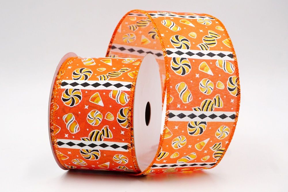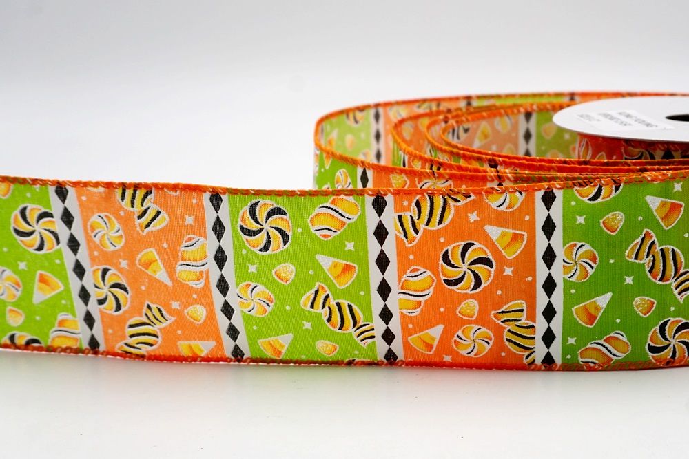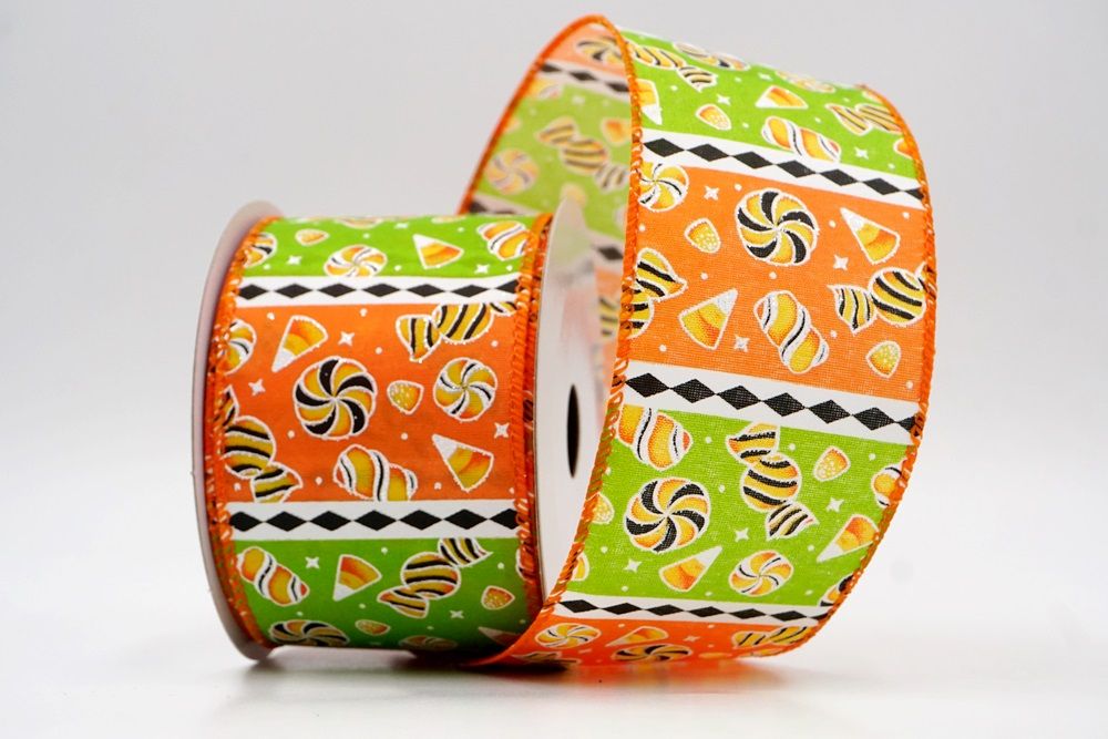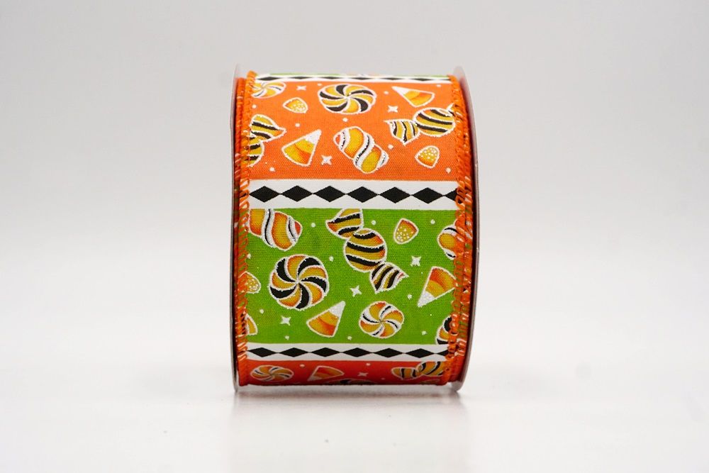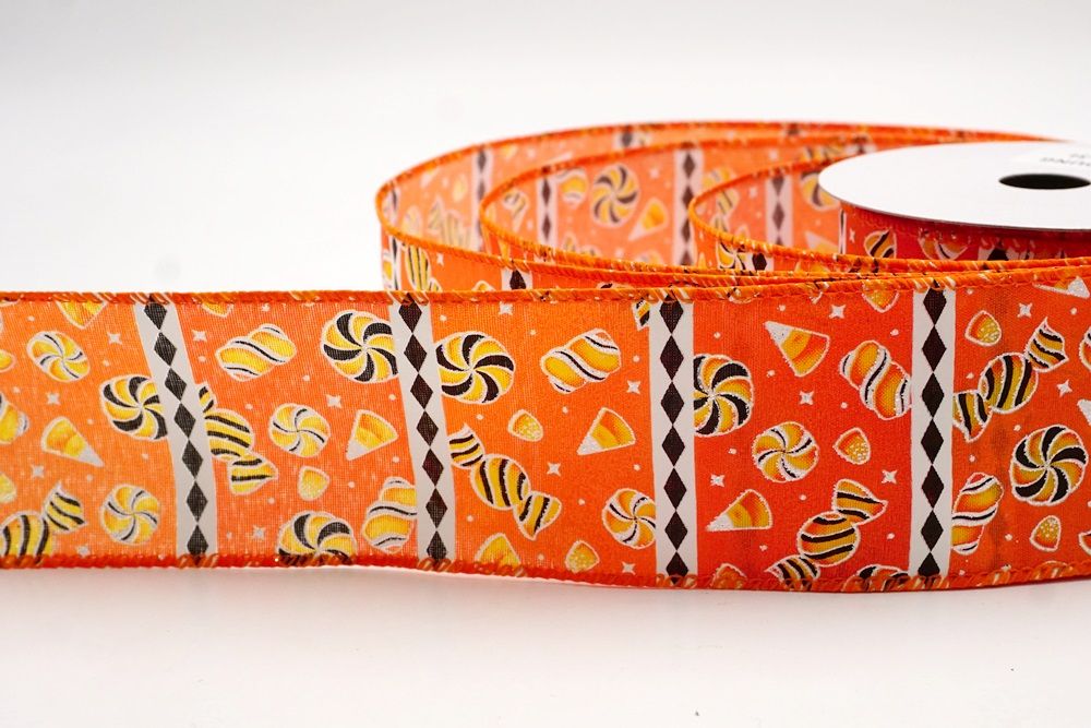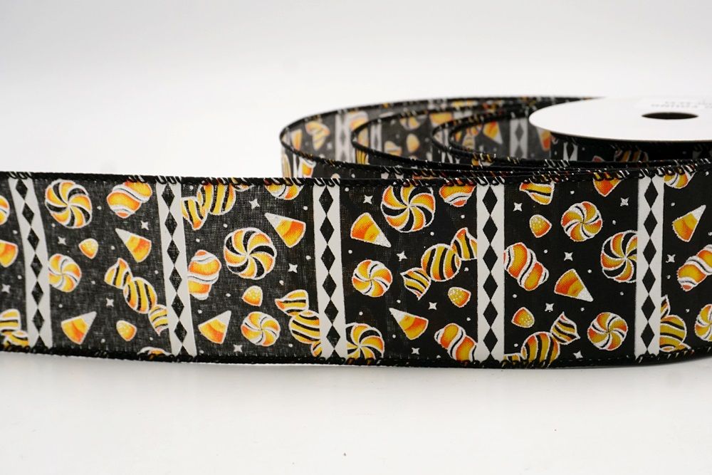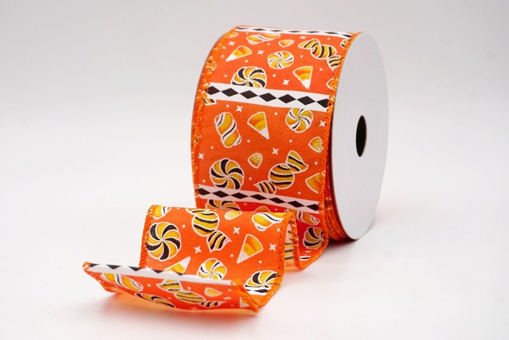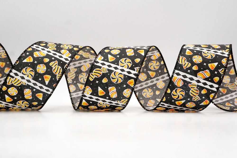 Візерунок на стрічці має дизайн краю, заповнений класичними цукерками для Хелловіна та графічною діамантовою смугою. Головний розділ зображення стрічки усіяний різними цукерками, включаючи обгортки з завитками та характерну форму цукерки у вигляді кукурудзи. Ці ласощі з'являються в типовій кольоровій гамі Хелловіна: оранжевому, чорному та білому. По горизонталі через центр проходить товста, контрастна смуга, яка має повторюваний діамантовий мотив, додаючи сильний візуальний розрив до насиченого візерунка. Кордон смуги допомагає красиво обрамити грайливий дизайн цукерок. Оскільки стрічка оснащена гнучким дротяним краєм, її легко формувати в складні петлі та структуровані хвости. Дріт допомагає стрічці зберігати охайний, професійний вигляд, навіть коли вона скручена або зігнута, що робить її надійним вибором для дизайнерів подій, яким потрібні стабільні, декоративні елементи.