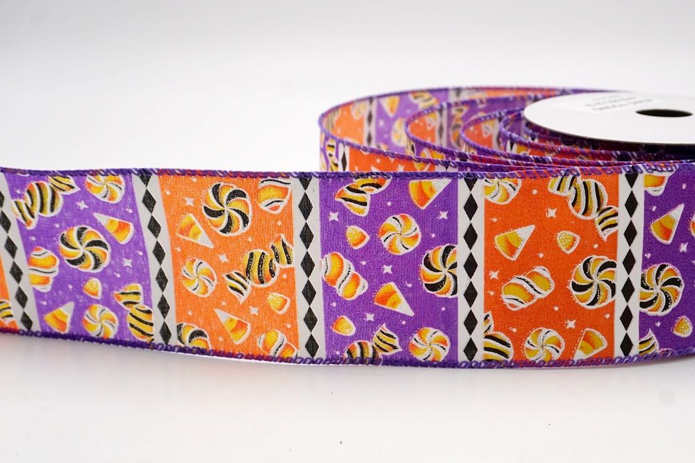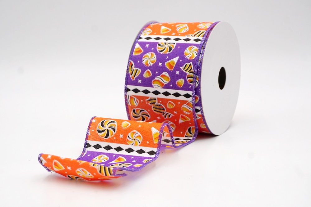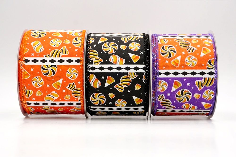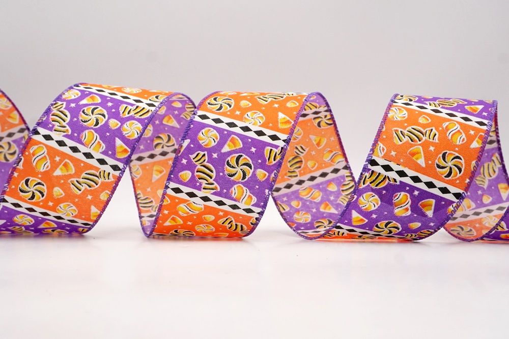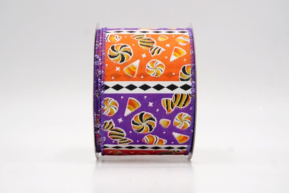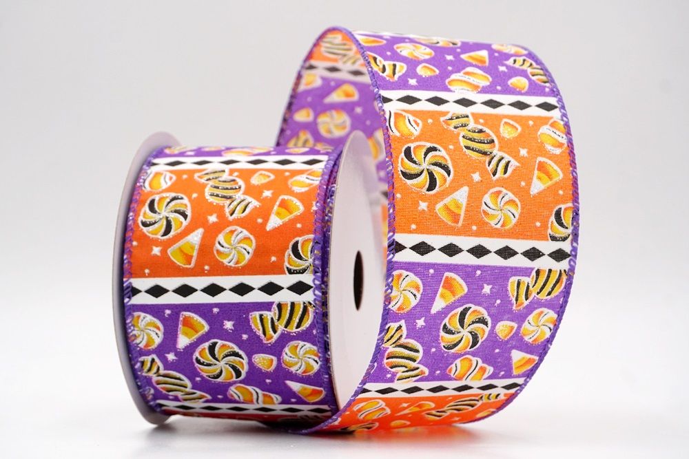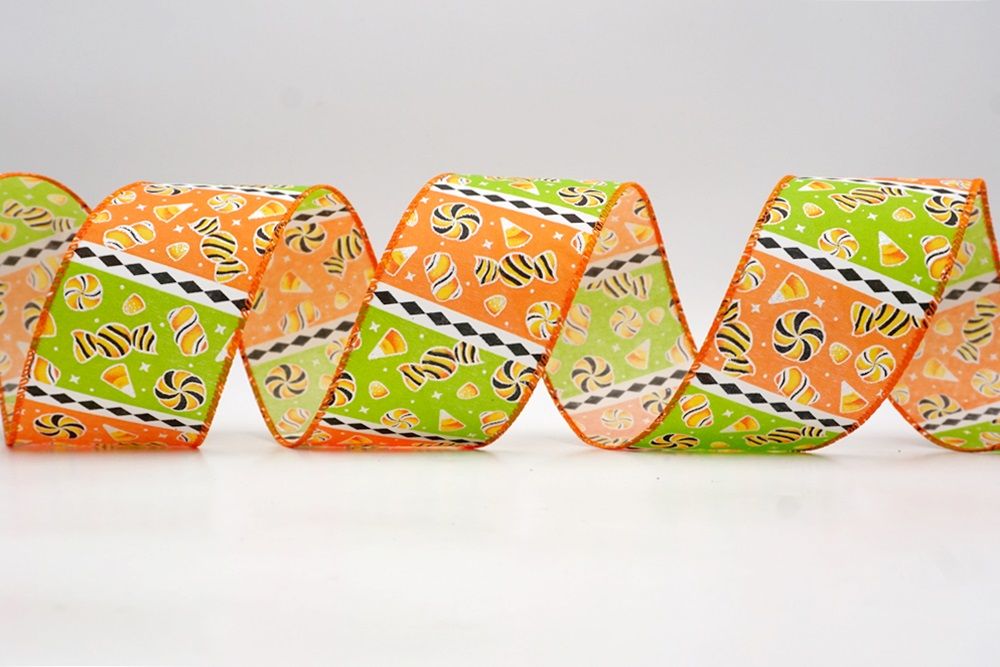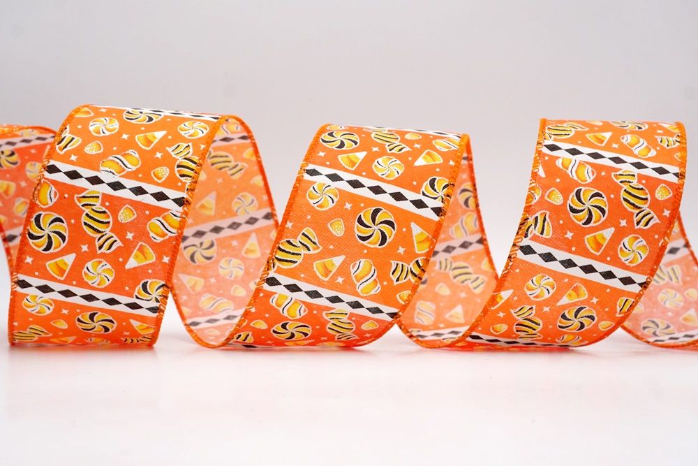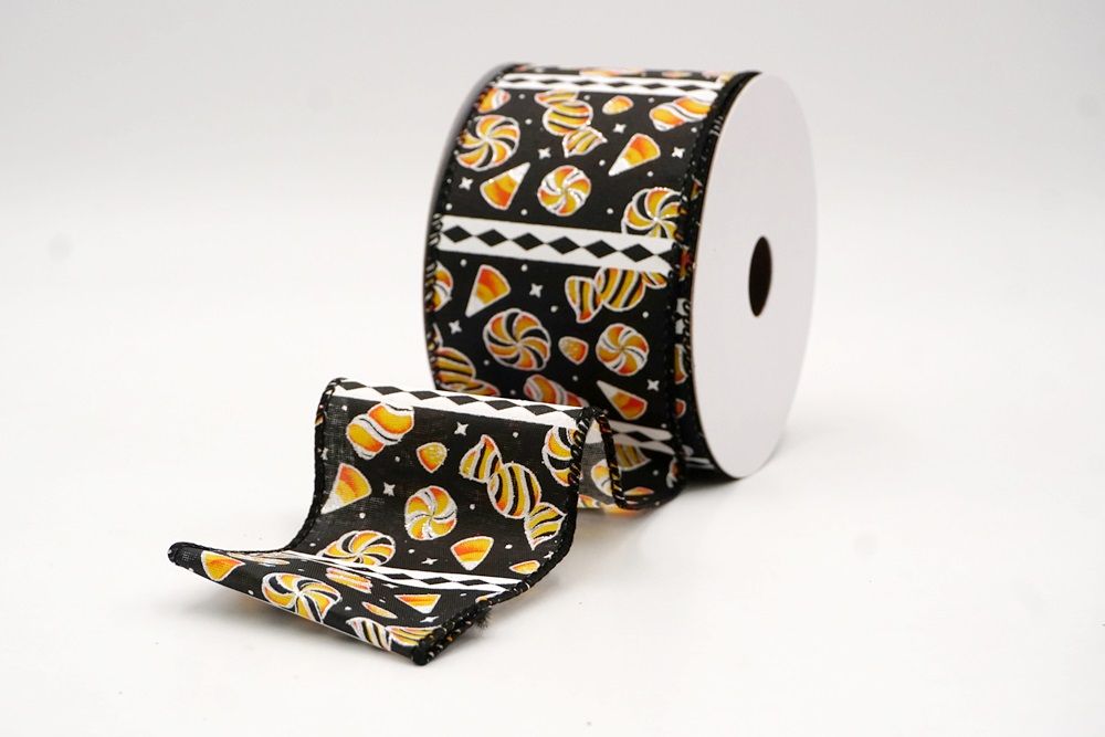 Візерунок на стрічці має дизайн краю, заповнений класичними цукерками для Хелловіна та графічною діамантовою смугою. Головний розділ зображення стрічки усіяний різними цукерками, включаючи обгортки з завитками та характерну форму цукерки у вигляді кукурудзи. Ці ласощі з'являються в типовій кольоровій гамі Хелловіна: оранжевому, чорному та білому. По горизонталі через центр проходить товста, контрастна смуга, яка має повторюваний діамантовий мотив, додаючи сильний візуальний розрив до насиченого візерунка. Кордон смуги допомагає красиво обрамити грайливий дизайн цукерок. Оскільки стрічка оснащена гнучким дротяним краєм, її легко формувати в складні петлі та структуровані хвости. Дріт допомагає стрічці зберігати охайний, професійний вигляд, навіть коли вона скручена або зігнута, що робить її надійним вибором для дизайнерів подій, яким потрібні стабільні, декоративні елементи.