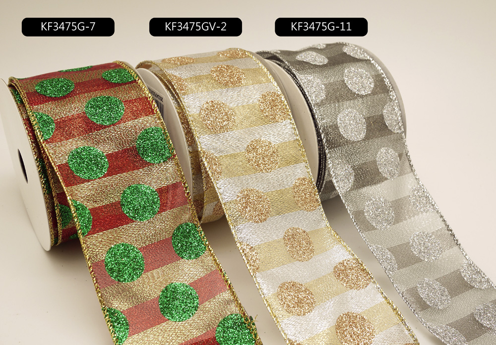 Металевий стрічковий двошатл має основу з двоколірними смужками та великими блискучими крапками по всій поверхні. Це ідеальний вибір для остаточного завершення, де ви хочете додати блиск або іскру. Край стрічки пришитий металевою ниткою, що відповідає кольору, і містить дріт, щоб ви могли легко згинати та формувати. Доступно в 3 кольорових комбінаціях і всіх розмірах. Простий і блискучий дизайн робить цю стрічку ідеальним доповненням до вашого різдвяного подарункового пакету, банта, вінка та всіх прикрас.