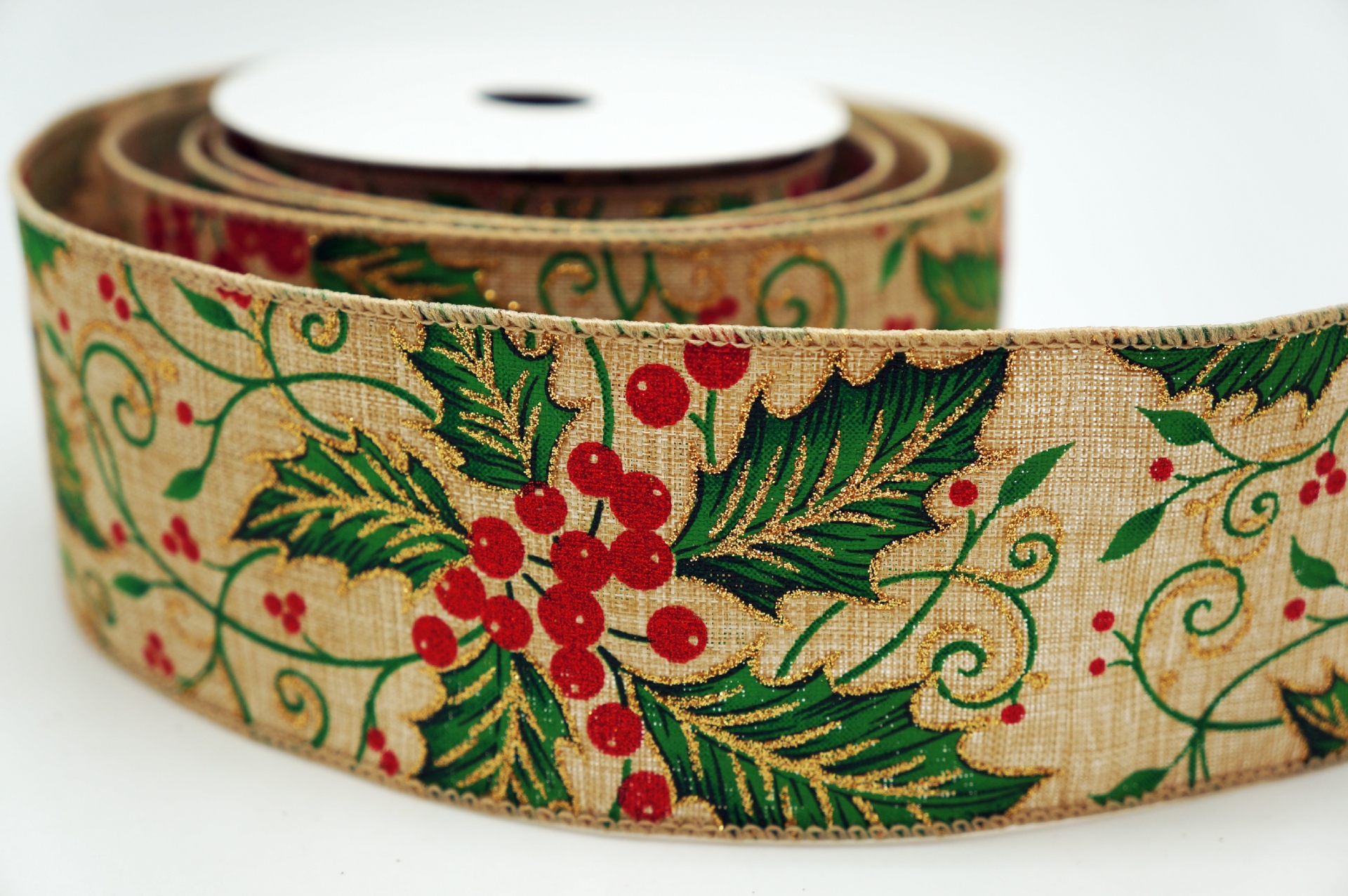 Стрічка з тканини під джут з дизайном святкових листя падуба та червоних ягід