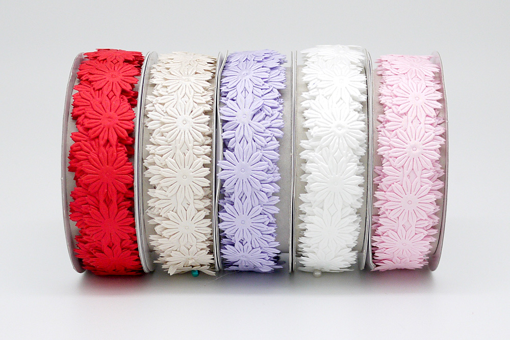 模切的织带造型,栩栩如生的小花图样。提供不同颜色作挑选:白色、红色、淡紫色、浅粉色和浅蓝色等(提供客制化的颜色制作!)。此款织带有正面与反面之分。织带的边缘用的是模切手法,呈现特殊的边缘造型,同时有效预防织带经拉扯或裁切后可能造成的损坏。此外,相较于加入细铁丝的织带,此款织带更能展现织带的灵活线条。