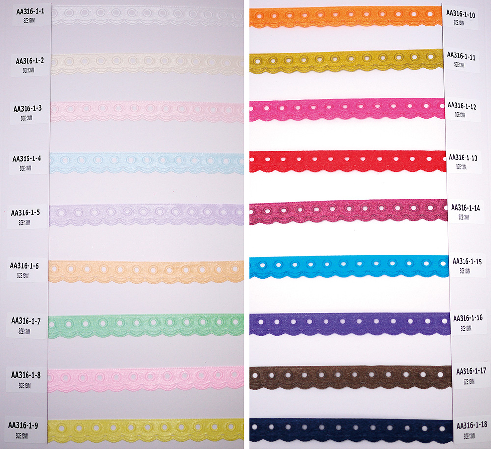 缎面的尼龙织带,以特殊的模切技术,印制出可爱的圆点图样,再加上波浪边缘设计,使织带更加生动、别致。有多种颜色可供挑选,也可以依照客户需求制作。特殊的收编手法使织带更加强韧坚固,在拉扯或裁剪后不易形成损害。此外,相较于加入细铁丝,此款更能够展现织带灵活、优美的线条。没有正面与反面之分。