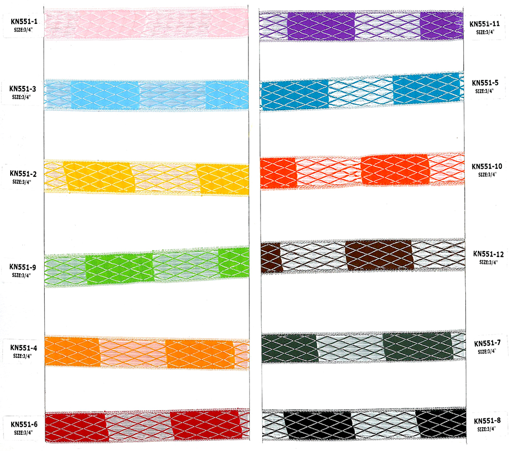 提花织带系列。粗糙的彩色磨纱和白色的光滑细丝相互编织而成,整条织带一体成型之外,还有立体的触感。此款织带没有正面与反面之分;织带的边缘用的是特殊的收边手法,有效预防织带经拉扯或裁切后可能造成的损坏。此外,相较于加入细铁丝的织带,此款织带更能展现织带的灵活线条。本系列织带可以依照客户需求制作不同搭配的款式。