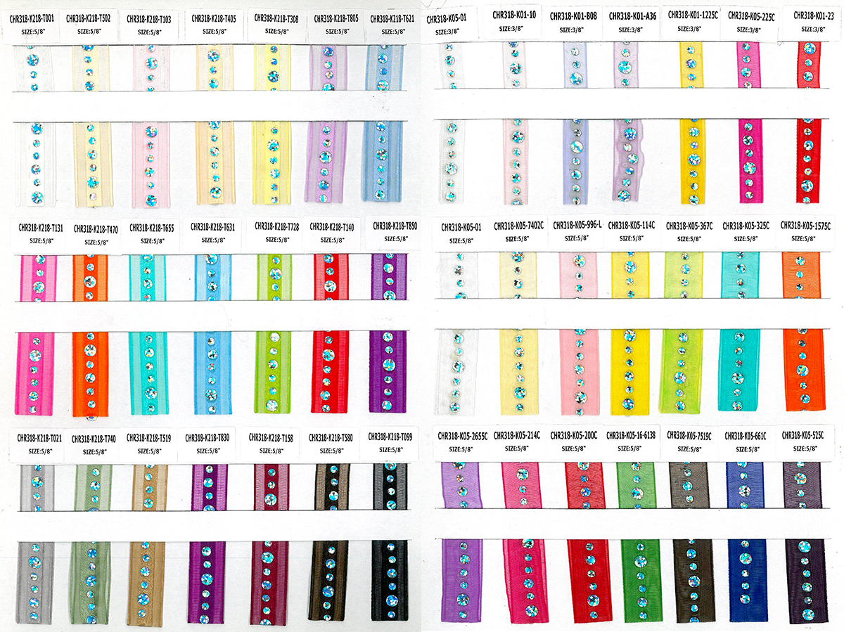 雪紗織帶,搭配燙金不規則圓形亮片,華麗又精緻。雪紗織帶的顏色皆可以依照客戶需求生產製作,亮片裝飾有銀色與金色可挑選。本款有正面與反面之分。織帶邊緣使用相特殊收編手法,使織帶經拉扯或剪裁後,不易受到損害,此外,相較於加入細鐵絲,此款更能展現織帶優美靈活的線條。