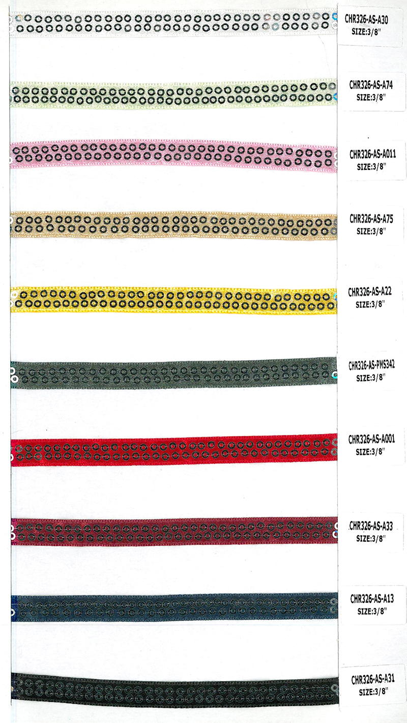 尼龍織帶,設計縫製排列亮片造型,可愛又引人注意。各種顏色皆可以依照客戶需求生產製作。本款有正面與反面之分。織帶邊緣使用相特殊收編手法,使織帶經拉扯或剪裁後,不易受到損害,此外,相較於加入細鐵絲,此款更能展現織帶優美靈活的線條。