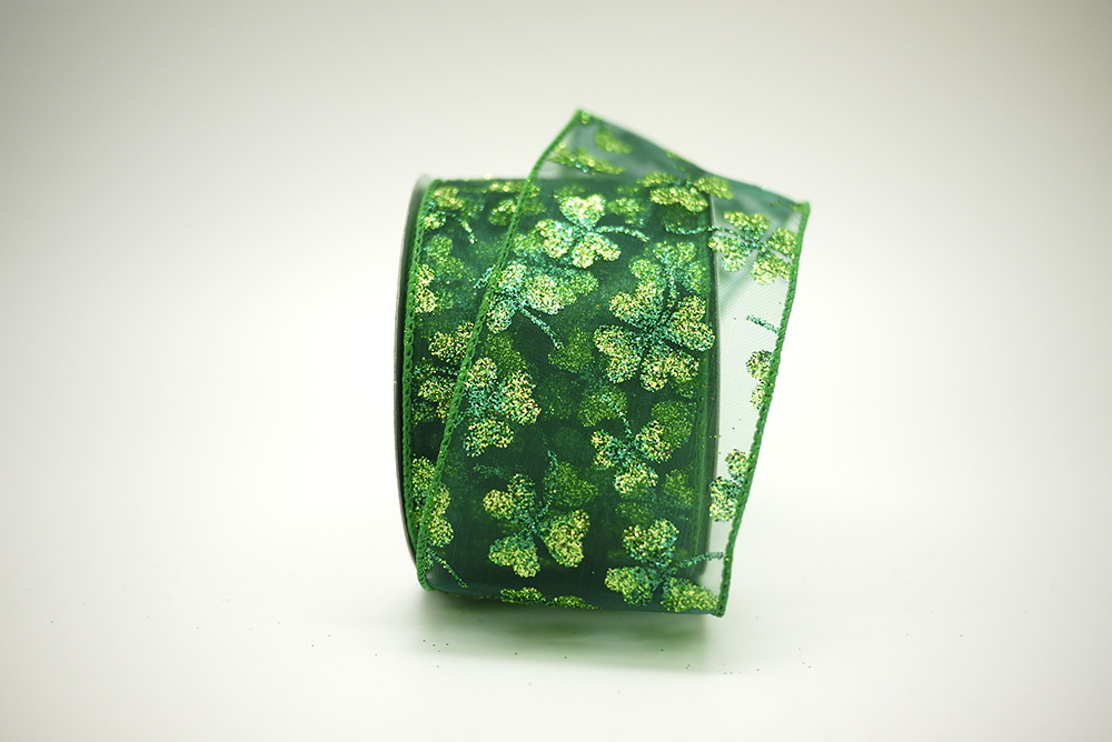 聖派翠克節的象徵,幸運草加上金蔥粉搭配雪紗,好不優雅大方。織帶的邊緣用相同色系的色紗包邊,美觀之外有效預防拉扯或裁切後可能造成的損壞,同時,加入細鐵絲更方便於任意造型的製作。