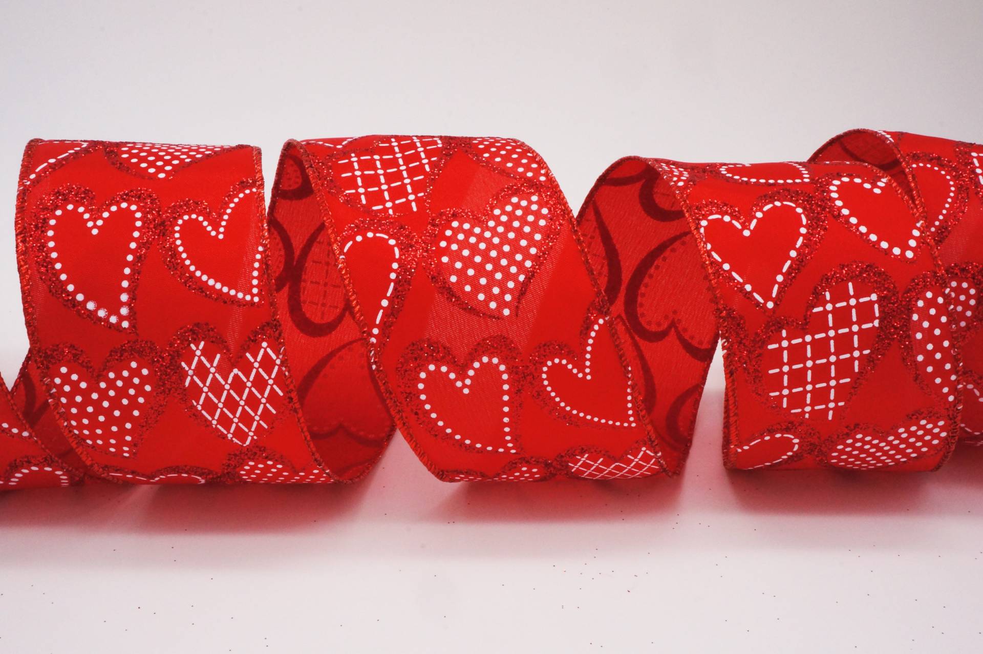 這款閃閃發光的愛心緞帶為情人節帶來炙熱甜美的氛圍!紅色亮蔥的愛心中心以低調白色小點與線條點綴,緞帶上還有各種愛心形狀閃耀,讓這條緞帶成為裝飾情人節的最佳選擇!我們也為這款甜美的設計搭配了兩種不同布底,粗仿麻布料與平紋布,不同的布底襯托出此款設計的不一樣風情.兩側配上霧面光澤拷克邊,鐵絲包邊縫製,能讓緞帶變化更多的造型設計,且不易變形損壞.在情人節這天綁上這條代表浪漫甜美的緞帶來宣示您們的愛情吧.也可供廣泛運用在生日派對的佈置、結婚典禮的佈置、情人節活動的佈置、活動場地的佈置、室內的佈置、禮品的包裝、手工花藝、玩具裝飾的設計、服裝的輔料以及飾品配件。